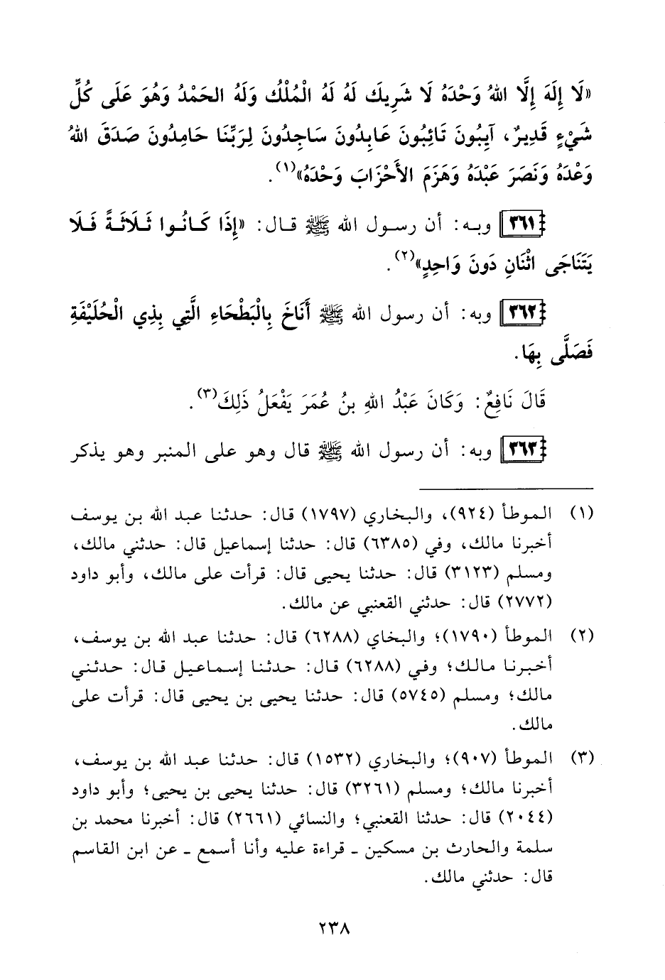 (¬3) الموطأ (907)؛ والبخاريُّ (1532) قال: حدثنا عبد الله بن يوسف، أخبرنا مالك؛ ومسلمٌ (3261) قال: حدثنا يحيى بن يحيى؛ وأبو داود (2044) قال: حدثنا القعنبي؛ والنسائيُّ (2661) قال: أخبرنا محمد بن سلمة والحارث بن مسكين -قراءة عليه وأنا أسمع- عن ابن القاسم قال: حدثني مالك.