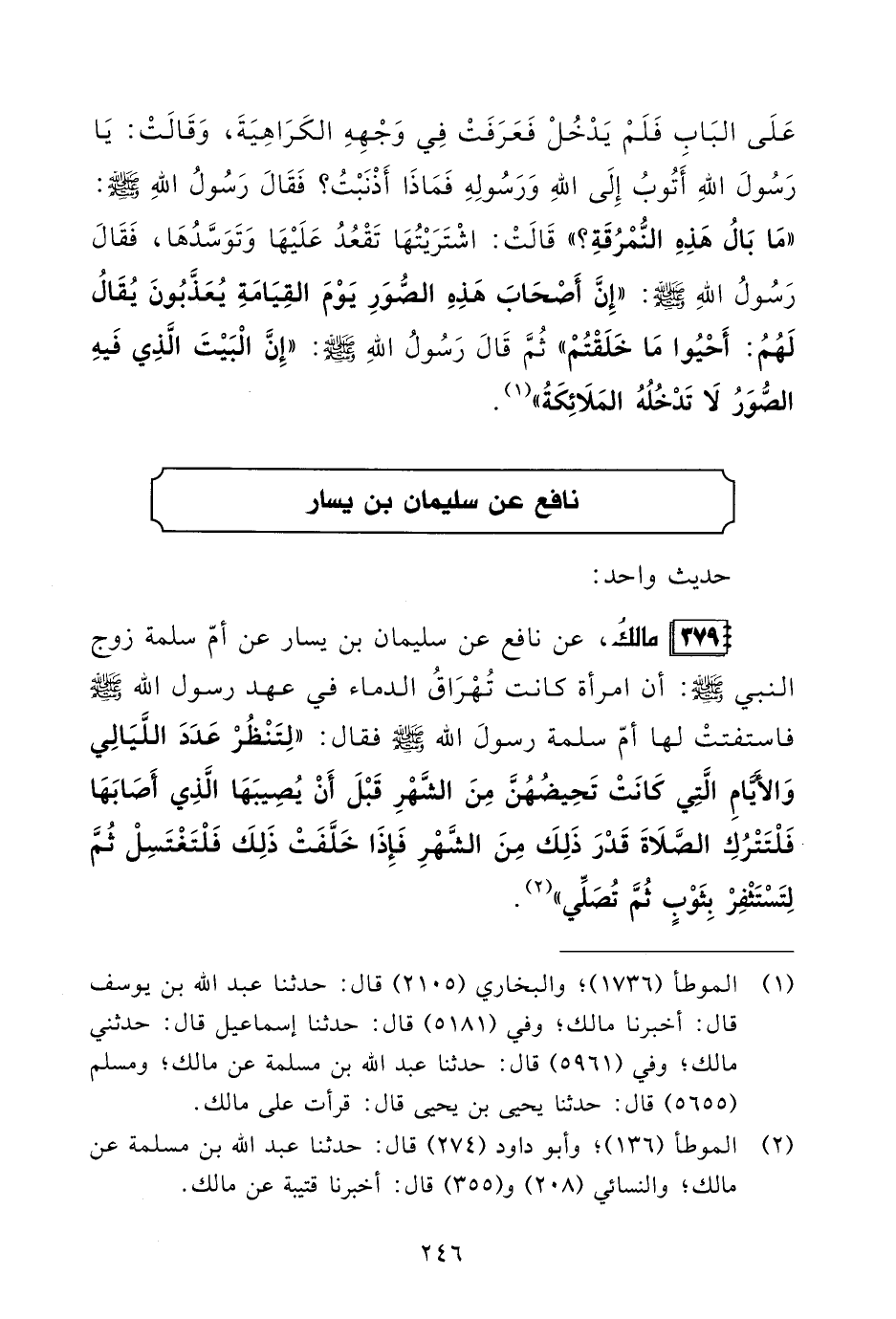 379 - مالكُ، عن نافع عن سليمان بن يسار عن أمّ سلمة زوج النبي - صلى الله عليه وسلم -: أن امرأة كانت تُهْرَاقُ الدماء في عهد رسول الله - صلى الله عليه وسلم - فاستفتتْ لها أمّ سلمة رسولَ الله - صلى الله عليه وسلم - فقال: "لِتَنْظُرْ عَدَدَ اللَّيَالِي وَالأَيَّامِ الَّتِي كَانَتْ تَحِيضُهُنَّ مِنَ الشَّهْرِ قَبْلَ أَنْ يُصِيبَهَا الَّذِي أَصَابَهَا فَلْتَتْرُكِ الصَّلَاةَ قَدْرَ ذَلِكَ مِنَ الشَّهْرِ فَإِذَا خَلَّفَتْ ذَلِكَ فَلْتَغْتَسِلْ ثُمَّ لِتَسْتَثْفِرْ بِثَوْبٍ ثُمَّ تُصَلِّي" (¬2).