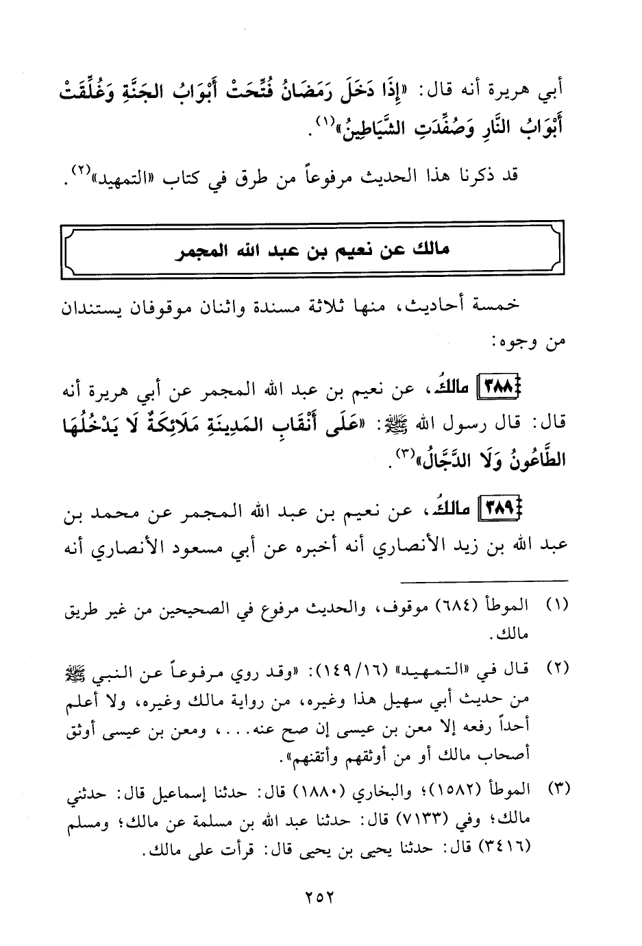 388 - مالكُ، عن نعيم بن عبد الله المجمر عن أبي هريرة أنه قال: قال رسول الله - صلى الله عليه وسلم -: "عَلَى أَنْقَابِ المَدِينَةِ مَلَائِكَةٌ لَا يَدْخُلُهَا الطَّاعُونُ وَلَا الدَّجَّالُ" (¬3).