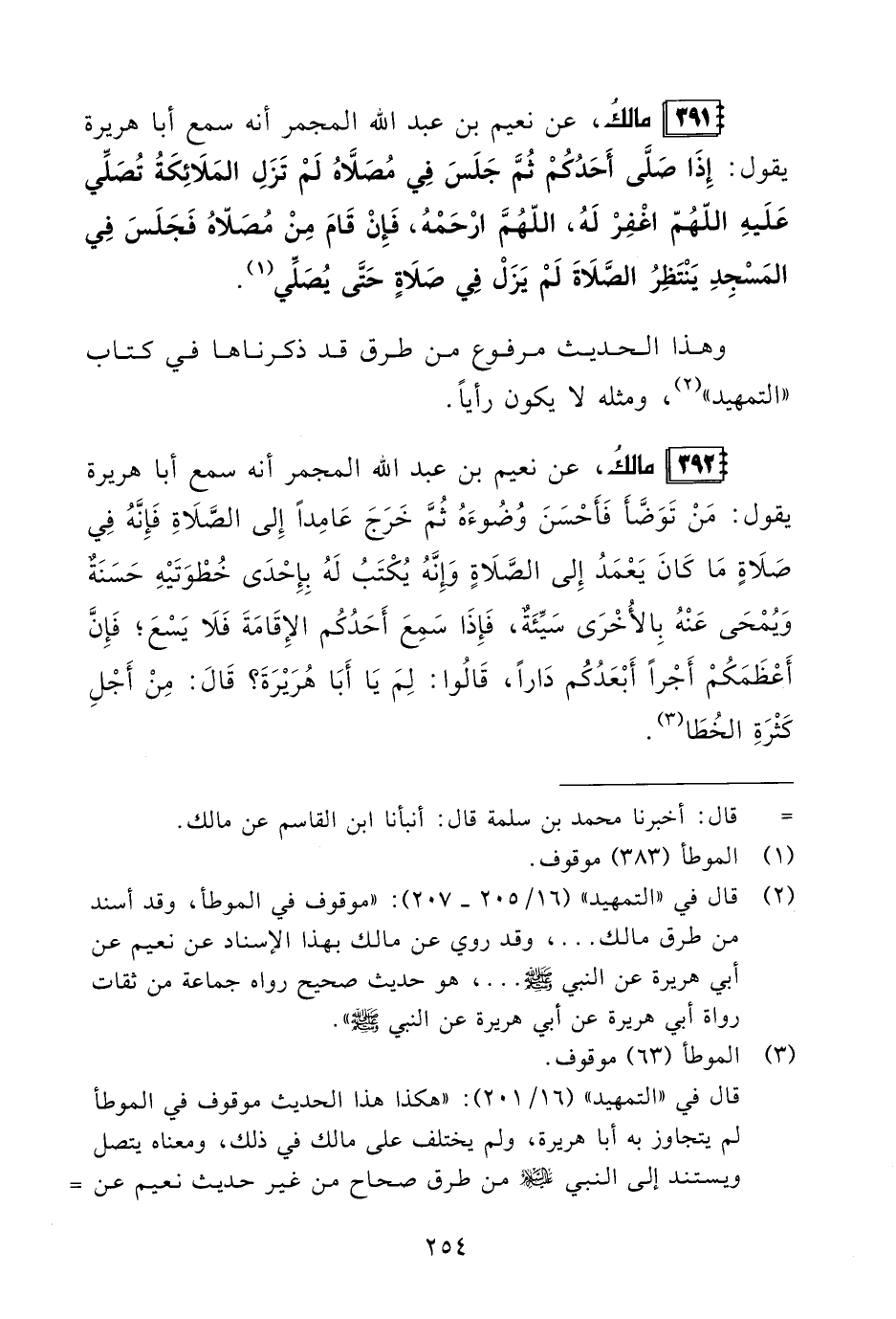 392 - مالكُ، عن نعيم بن عبد الله المجمر أنه سمع أبا هريرة يقول: مَنْ تَوَضَّأَ فَأَحْسَنَ وُضُوءَهُ ثُمَّ خَرَجَ عَامِدًا إِلى الصَّلَاةِ فَإِنَّهُ فِي صَلَاةٍ مَا كَانَ يَعْمَدُ إِلى الصَّلَاةٍ وَإِنَّهُ يُكْتَبُ لَهُ بِإِحْدَى خُطْوَتَيْهِ حَسَنَةٌ وَيُمْحَى عَنْهُ بِالأُخْرَى سَيِّئَةٌ، فَإِذَا سَمِعَ أَحَدُكُم الإِقَامَةَ فَلَا يَسْعَ؛ فَإِنَّ أَعْظَمَكُمْ أَجْرًا أَبْعَدُكُم دَارًا، قَالُوا: لِمَ يَا أَبَا هُرَيْرَةَ؟ قَالَ: مِنْ أَجْلِ كَثْرَةِ الخُطَا (¬3).