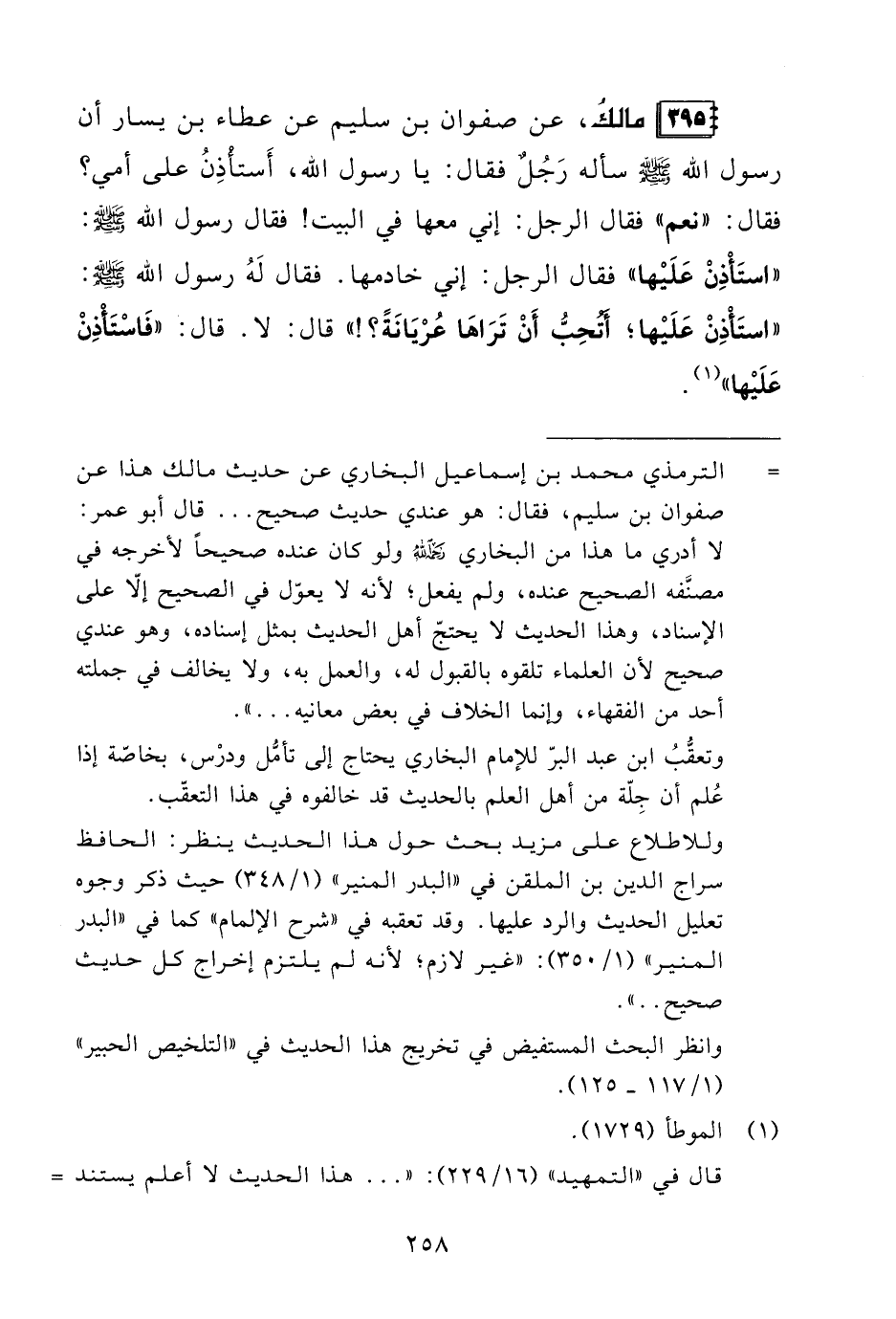 395 - مالكُ، عن صفوان بن سليم عن عطاء بن يسار أن رسول الله - صلى الله عليه وسلم - سأله رَجُلٌ فقال: يا رسول الله، أَستأْذِنُ على أمي؟ فقال: "نعم" فقال الرجل: إني معها في البيت! فقال رسول الله - صلى الله عليه وسلم -: "استَأْذِنْ عَلَيْها" فقال الرجل: إني خادمها. فقال لَهُ رسول الله - صلى الله عليه وسلم -: "استَأْذِنْ عَلَيْها، أَتُحِبُّ أَنْ تَرَاهَا عُرْيَانَةً؟ ! " قال: لا. قال: "فَاسْتَأْذِنْ عَلَيْها" (¬1).