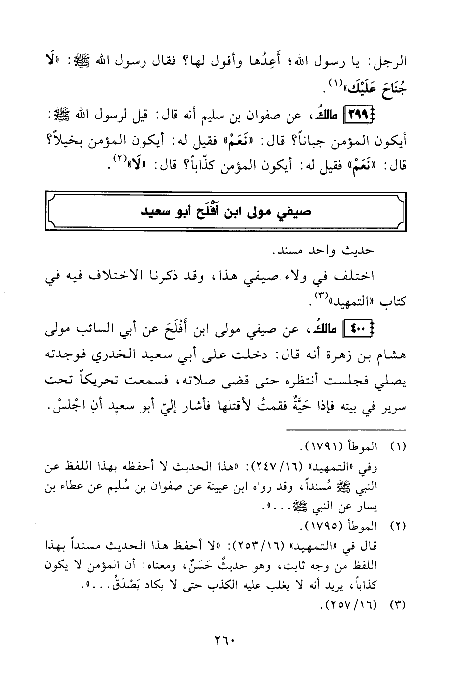 400 - مالكُ، عن صيفي مولى ابن أَفْلَحَ عن أبي السائب مولى هشام بن زهرة أنه قال: دخلت على أبي سعيد الخدري فوجدته يصلى فجلست أنتظره حتى قضى صلاته، فسمعت تحريكًا تحت