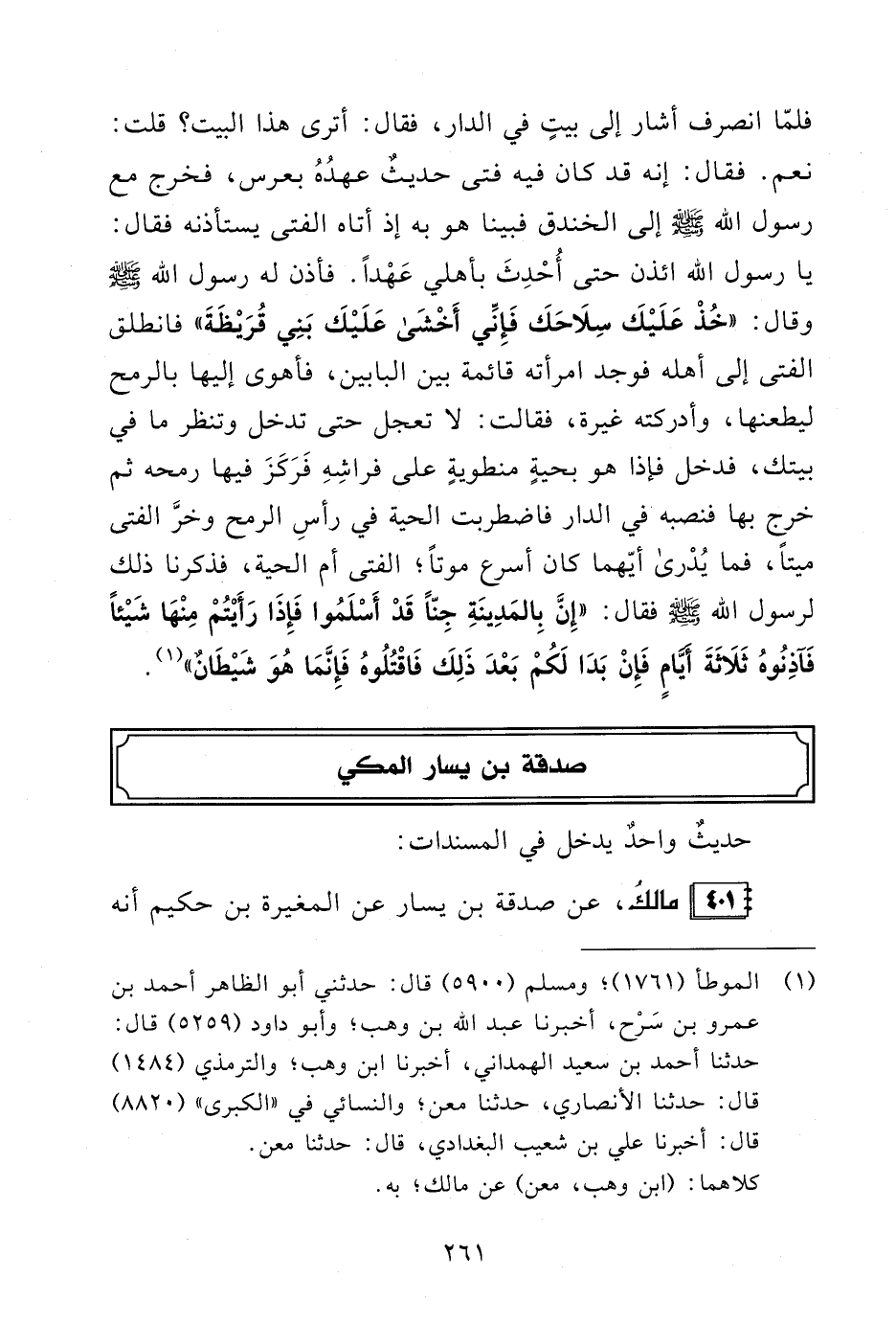 فلمّا انصرف أشار إلى بيتٍ في الدار، فقال: أترى هذا البيت؟ قلت: نعم. فقال: إنه قد كان فيه فتى حديثٌ عهدُهُ بعرس، فخرج مع رسول الله - صلى الله عليه وسلم - إلى الخندق فبينا هو به إذ أتاه الفتى يستأذنه فقال: يا رسول الله ائذن حتى أُحْدِثَ بأهلي عَهْداً. فأذن له رسول الله - صلى الله عليه وسلم - وقال: "خُذْ عَلَيْكَ سِلَاحَكَ فَإِنِّي أَخْشَى عَلَيْكَ بَنِي قُرَيْظَةَ" فانطلق الفتى إلى أهله فوجد امرأته قائمة بين البابين، فأهوى إليها بالرمح ليطعنها، وأدركته غيرة، فقالت: لا تعجل حتى تدخل وتنظر ما في بيتك، فدخل فإذا هو بحيةٍ منطويةٍ على فراشِهِ فَرَكَزَ فيها رمحه ثم خرج بها فنصبه في الدار فاضطربت الحية في رأسِ الرمح وخرَّ الفتى ميتًا، فما يُدْرى أيّهما كان أسرع موتًا؟ الفتى أم الحية، فذكرنا ذلك لرسول الله - صلى الله عليه وسلم - فقال: "إِنَّ بِالمَدِينَةِ جِنًّا قَدْ أَسْلَمُوا فَإِذَا رَأَيْتُمْ مِنْهَا شَيْئًا فَآذِنُوهُ ثَلَاَثَةَ أَيَّامٍ فَإِنْ بَدَا لَكُمْ بَعْدَ ذَلِكَ فَاقْتُلُوهُ فَإِنَّمَا هُوَ شَيْطَانٌ" (¬1).