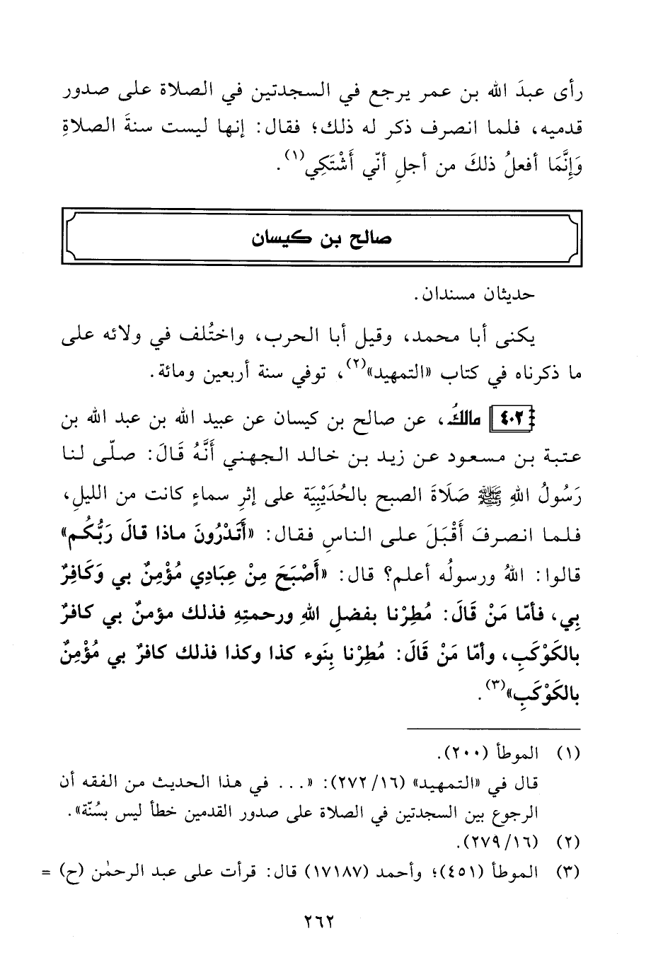 402 - مالكُ، عن صالح بن كيسان عن عبيد الله بن عبد الله بن عتبة بن مسعود عن زيد بن خالد الجهني أَنَّهُ قَالَ: صلّى لنا رَسُولُ اللهِ - صلى الله عليه وسلم - صلَاةَ الصبح بالحُدَيْبِيَة على إثرِ سماءٍ كانت من الليلِ، فلما انصرفَ أَقْبَلَ على الناسِ فقال: "أَتَدْرُونَ ماذا قالَ رَبُّكُم" قالوا: اللهُ ورسولُه أعلم؟ قال: "أَصْبَحَ مِنْ عِبَادِي مُؤْمِنٌ بي وَكَافِرٌ بِي، فأمّا مَنْ قَالَ: مُطِرْنا بفضلِ اللهِ ورحمتِهِ فذلك مؤمنٌ بي كافرٌ بالكَوْكَبِ، وأمّا مَنْ قَالَ: مُطِرْنا بِنَوء كذا وكذا فذلك كافرٌ بي مُؤْمِنٌ بالكَوْكَبِ" (¬3).