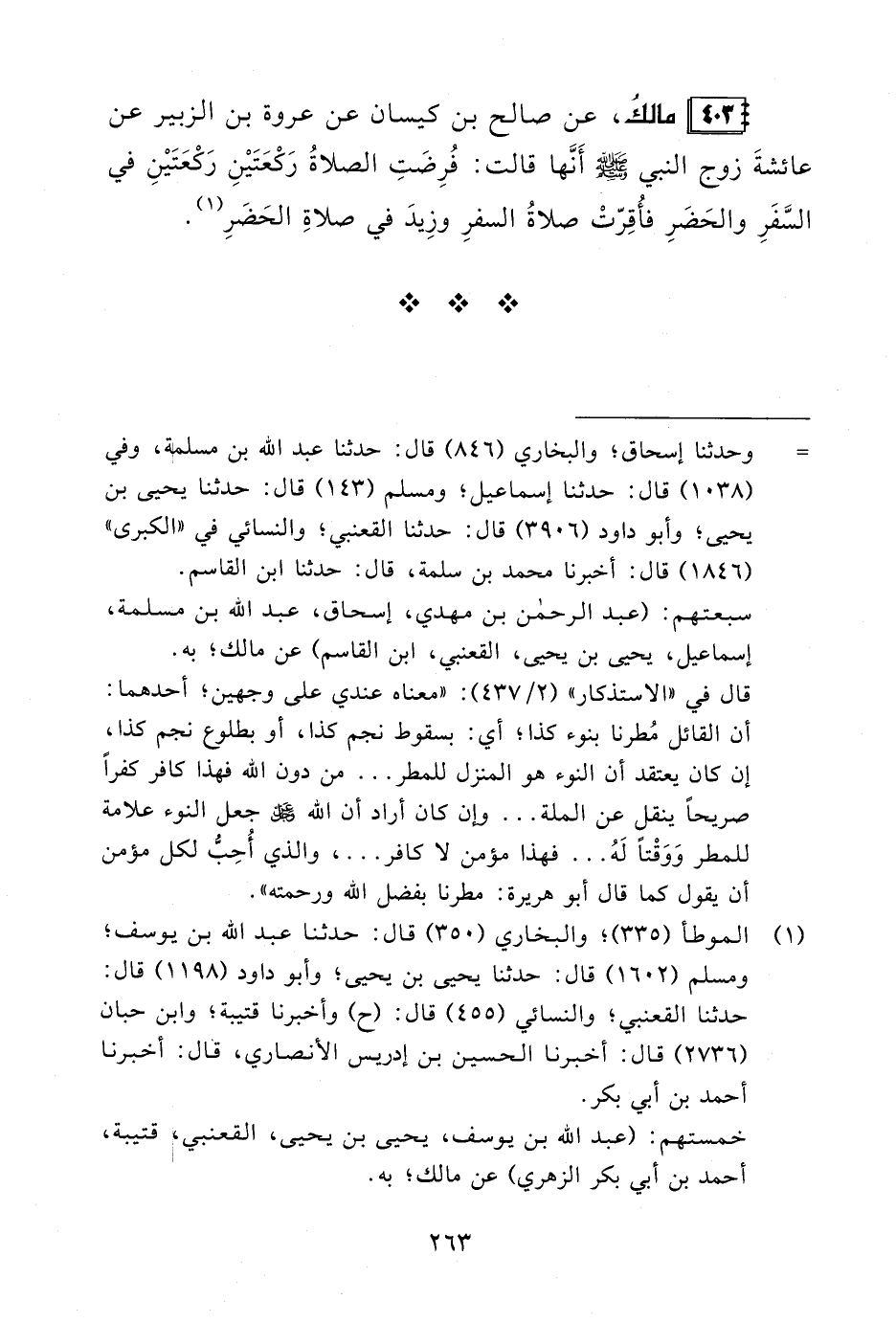 403 - مالكُ، عن صالح بن كيسان عن عروة بن الزبير عن عائشةَ زوج النبي - صلى الله عليه وسلم - أَنَّها قالت: فُرِضَتِ الصلاةُ رَكْعَتَيْنِ رَكْعَتَيْنِ في السَّفَرِ والحَضَرِ فأُقِرّتْ صلاةُ السفرِ وزِيدَ في صلاةِ الحَضَرِ (¬1).