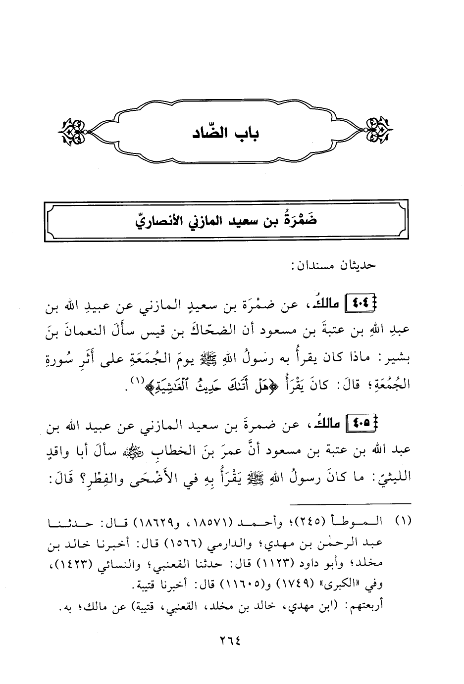 404 - مالكُ، عن ضمْرَة بن سعيدٍ المازني عن عبيدِ الله بن عبدِ اللهِ بن عتبةَ بن مسعود أن الضحّاكَ بن قيس سأَلَ النعمانَ بنَ بشير: ماذا كان يقرأُ به رسولُ اللهِ - صلى الله عليه وسلم - يومَ الجُمَعَةِ على أَثَرِ سُورةِ الجُمُعَةِ؛ قالَ: كانَ يَقْرَأُ {هَلْ أَتَاكَ حَدِيثُ الْغَاشِيَةِ} (¬1).