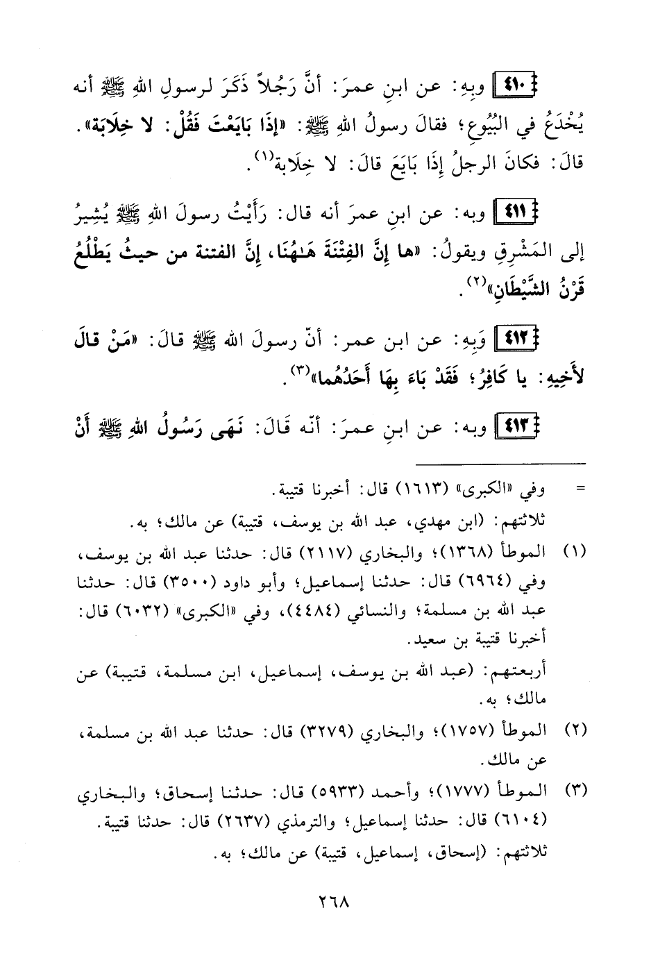 412 - وَبِهِ: عن ابن عمر: أنّ رسولَ الله - صلى الله عليه وسلم - قالَ: "مَنْ قالَ لأَخِيهِ: يا كَافِرُ؛ فَقَدْ بَاءَ بِهَا أَحَدُهُما" (¬3).