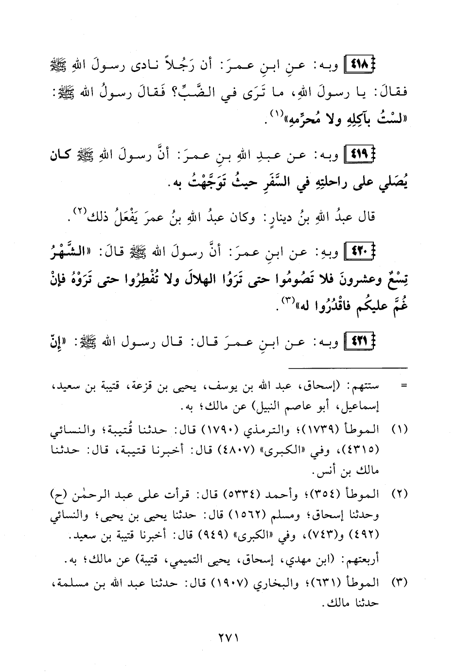 419 - وبه: عن عبدِ اللهِ بنِ عمرَ: أنَّ رسولَ اللهِ - صلى الله عليه وسلم - كان يُصَلي على راحلتِهِ في السَّفَرِ حيثُ تَوَجَّهْتُ به.