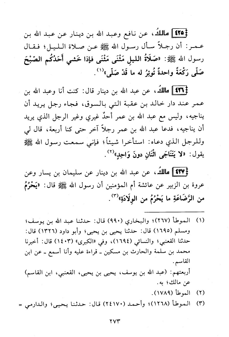 425 - مالكُ، عن نافع وعبد الله بن دينار عن عبد الله بن عمر: أن رجلًا سأل رسول الله - صلى الله عليه وسلم - عن صلاة الليل؛ فقال رسول الله - صلى الله عليه وسلم -: "صَلَاةُ الليلِ مَثْنَى مَثْنَى فإذا خَشي أَحَدُكُم الصّبْحَ صَلّى رَكعَةً واحدةً تُوتِرُ له ما قَدْ صَلّى" (¬1).