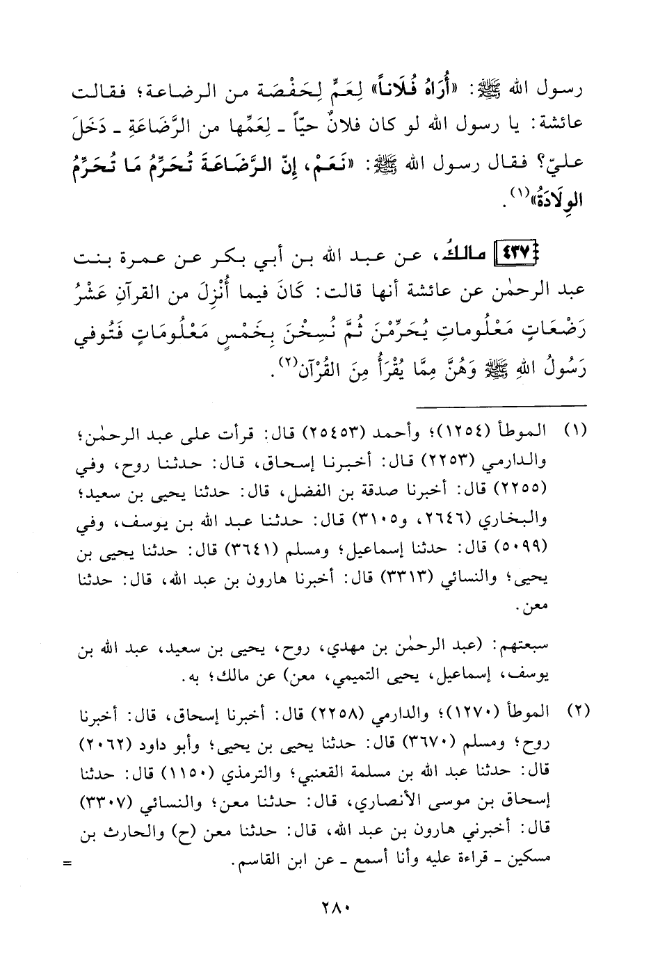 437 - مالكُ، عن عبد الله بن أبي بكر عن عمرة بنت عبد الرحمن عن عائشة أنها قالت: كَانَ فيما أُنْزِلَ من القرآنِ عَشْرُ رَضْعَاتٍ مَعْلُوماتِ يُحَرِّمْنَ ثُمَّ نُسِخْنَ بِخَمْسٍ مَعْلُومَاتٍ فَتُوفي رَسُولُ اللهِ - صلى الله عليه وسلم - وَهُنَّ مِمَّا يُقْرَأُ مِنَ القُرْآن (¬2).