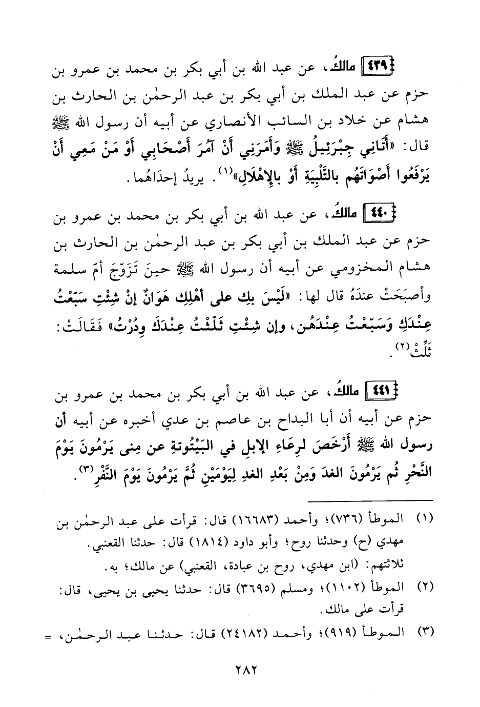 439 - مالكُ، عن عبد الله بن أبي بكر بن محمد بن عمرو بن حزم عن عبد الملك بن أبي بكر بن عبد الرحمن بن الحارث بن هشام عن خلاد بن السائب الأنصاري عن أبيه أن رسول الله - صلى الله عليه وسلم - قال: "أَتَانِي جِبْرَئِيلُ - صلى الله عليه وسلم - وَأَمَرَنِي أَنْ آمُرَ أَصْحَابِي أَوْ مَنْ مَعِي أَنْ يَرْفَعُوا أَصْوَاتَهُم بالتَّلْبِيَةِ أَوْ بالإِهْلَالِ" (¬1). يريدُ إحدَاهُما.