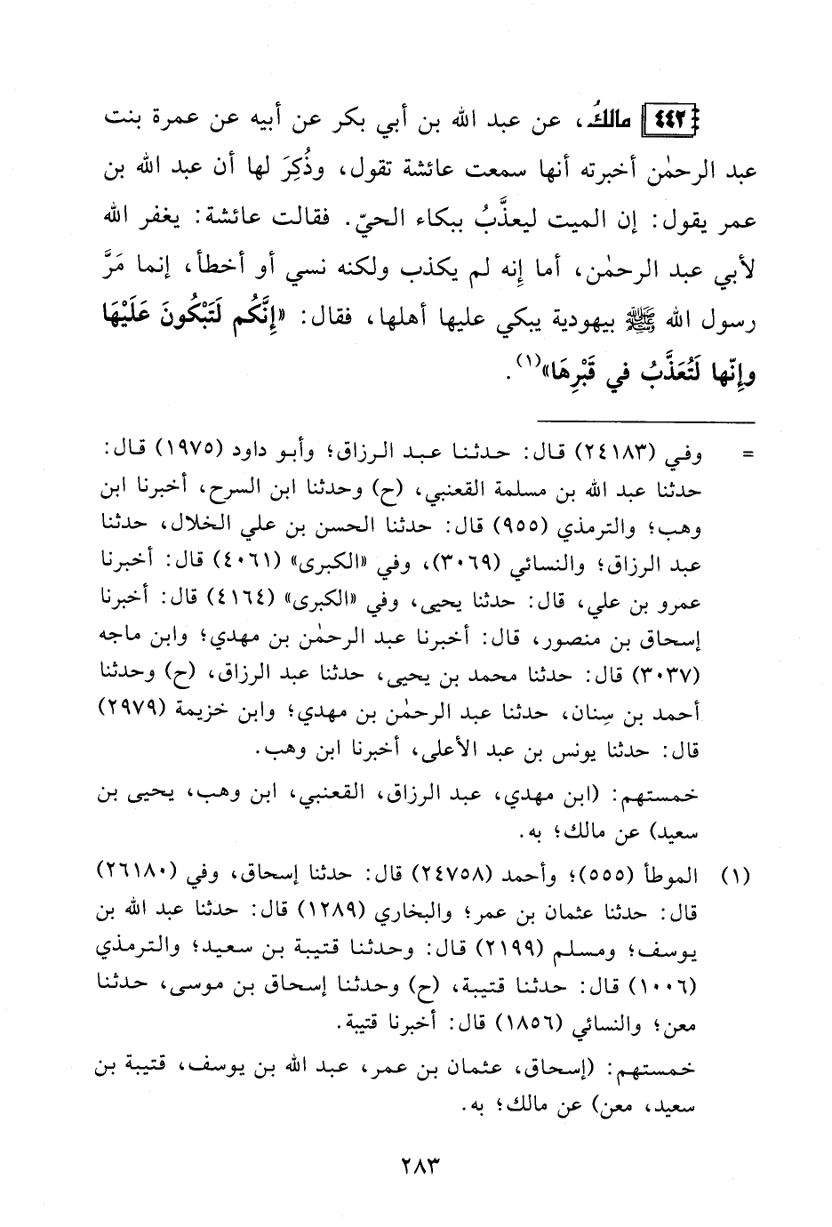 442 - مالكُ، عن عبد الله بن أبي بكر عن أبيه عن عمرة بنت عبد الرحمن أخبرته أنها سمعت عائشة تقول، وذُكِرَ لها أن عبد الله بن عمر يقول: إن الميت ليعذَّبُ ببكاء الحيّ. فقالت عائشة: يغفر الله لأبي عبد الرحمن، أما إِنه لم يكذب ولكنه نسي أو أخطأ، إنما مَرَّ رسول الله - صلى الله عليه وسلم - بيهودية يبكي عليها أهلها، فقال: "إِنَّكُم لَتَبْكُونَ عَلَيْهَا وإِنّها لَتُعَذَّبُ في قَبْرِهَا" (¬1).