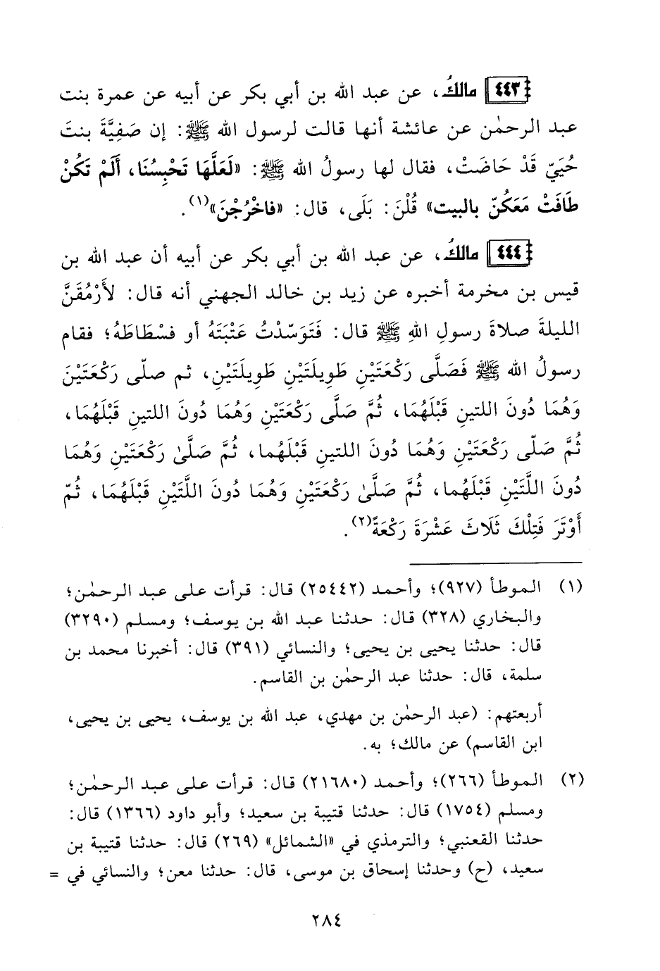 (¬1) الموطأ (927)، وأحمدُ (25442) قال: قرأت على عبد الرحمن؛ والبخاريُّ (328) قال: حدثنا عبد الله بن يوسف؛ ومسلمٌ (3290) قال: حدثنا يحيى بن يحيى؛ والنسائيُّ (391) قال: أخبرنا محمد بن سلمة، قال: حدثنا عبد الرحمن بن القاسم.