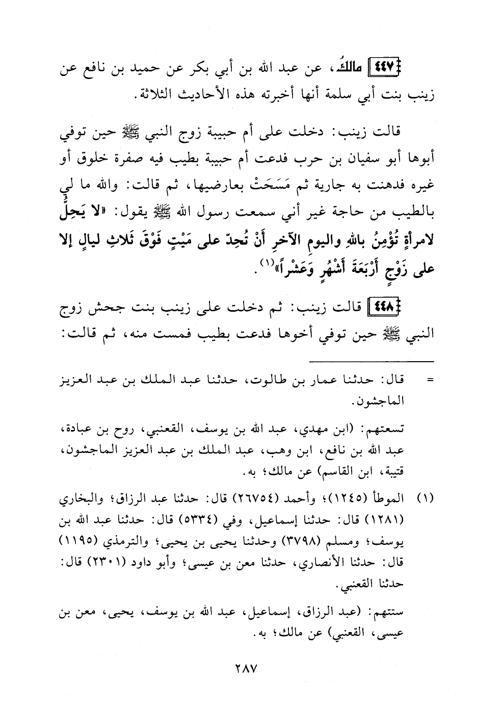 447 - مالكُ، عن عبد الله بن أبي بكر عن حميد بن نافع عن زينب بنت أبي سلمة أنها أخبرته هذه الأحاديث الثلاثة.