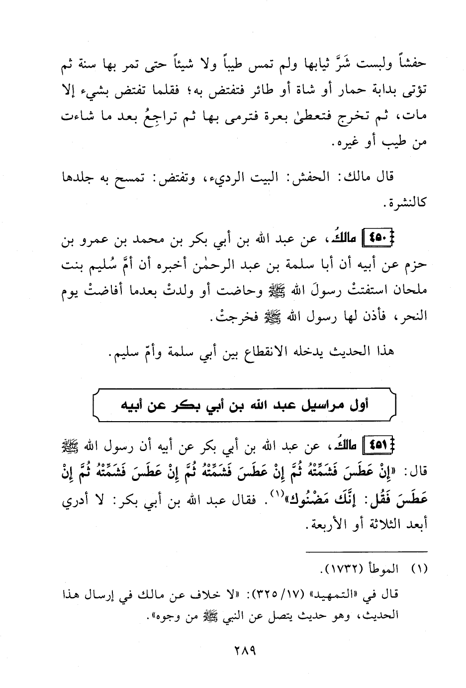 450 - مالكُ، عن عبد الله بن أبي بكر عن أبيه أن رسول الله - صلى الله عليه وسلم - قال: "إِنْ عَطَسَ فَشَمِّتْهُ ثُمَّ إِنْ عَطَسَ فَشَمِّتْهُ ثُمَّ إِنْ عَطَسَ فَشَمِّتْة ثُمَّ إِنْ عَطَسَ فَقُل: إنَّكَ مَضْنُوك" (¬1). فقال عبد الله بن أبي بكر: لا أدري أبعد الثلاثة أو الأربعة.