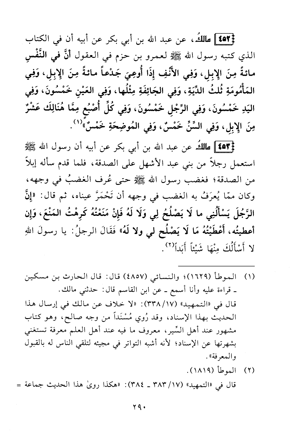 452 - مالكُ، عن عبد الله بن أبي بكر عن أبيه أن في الكتاب الذي كتبه رسول الله - صلى الله عليه وسلم - لعمرو بن حزم في العقول أنَّ في النَّفْسِ مائةً مِنَ الإبِلِ، وَفِي الأَنْفِ إِذَا أُوعِيَ جَدْعًا مائةً مِنَ الابِلِ، وَفِي المَأْمُومَةِ ثُلثُ الدِّيَةِ، وَفِي الجَائِفَةِ مِثْلُها، وَفِي العَيْنِ خَمْسُونَ، وَفِي اليَدِ خَمْسُونَ، وَفِي الرِّجْلِ خَمْسُونَ، وَفِي كُلِّ أُصْبُعٍ مِمَّا هُنَالِكَ عَشْرٌ مِنَ الإبِلِ، وَفِي السِّنِّ خَمْسٌ، وَفِي المُوضِحَة خَمْسٌ" (¬1).