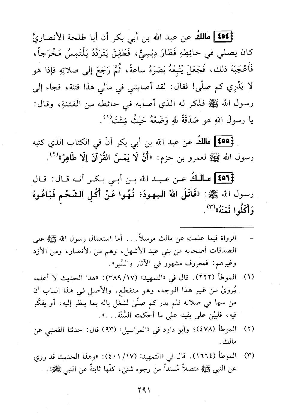 455 - مالكُ عن عبد الله بن أبي بكر أنّ في الكتاب الذي كتبه رسول الله - صلى الله عليه وسلم - لعمرو بن حزم: "أَن لَا يَمَسَّ القُرْآنَ إلّا طَاهِرٌ" (¬2).