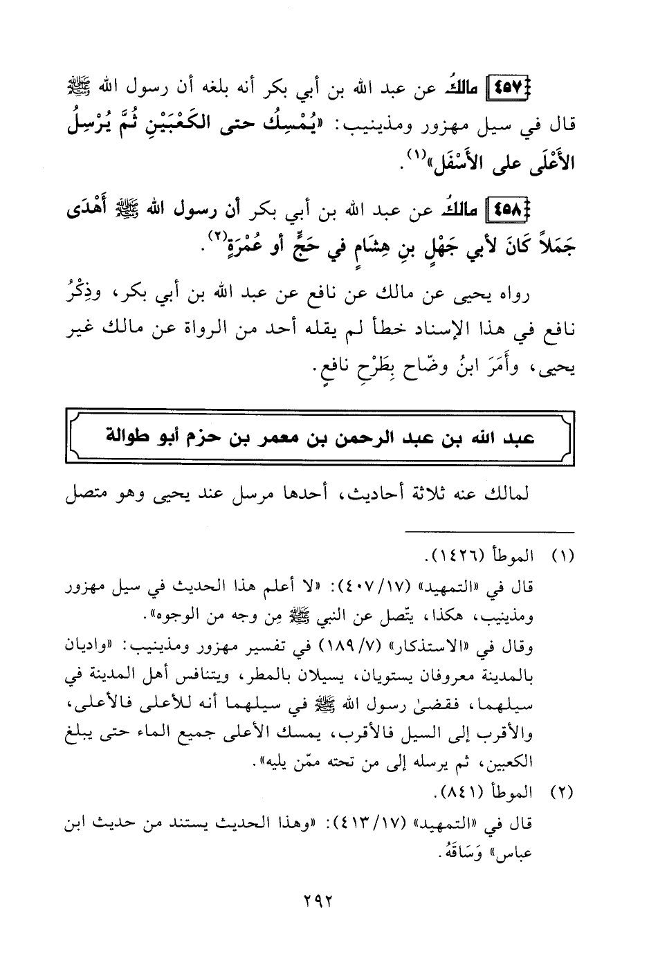 458 - مالكُ عن عبد الله بن أبي بكر أن رسول الله - صلى الله عليه وسلم - أَهْدَى جَمَلًا كَانَ لأبي جَهْلٍ بنِ هِشَامٍ في حَجٍّ أو عُمْرَةٍ (¬2).