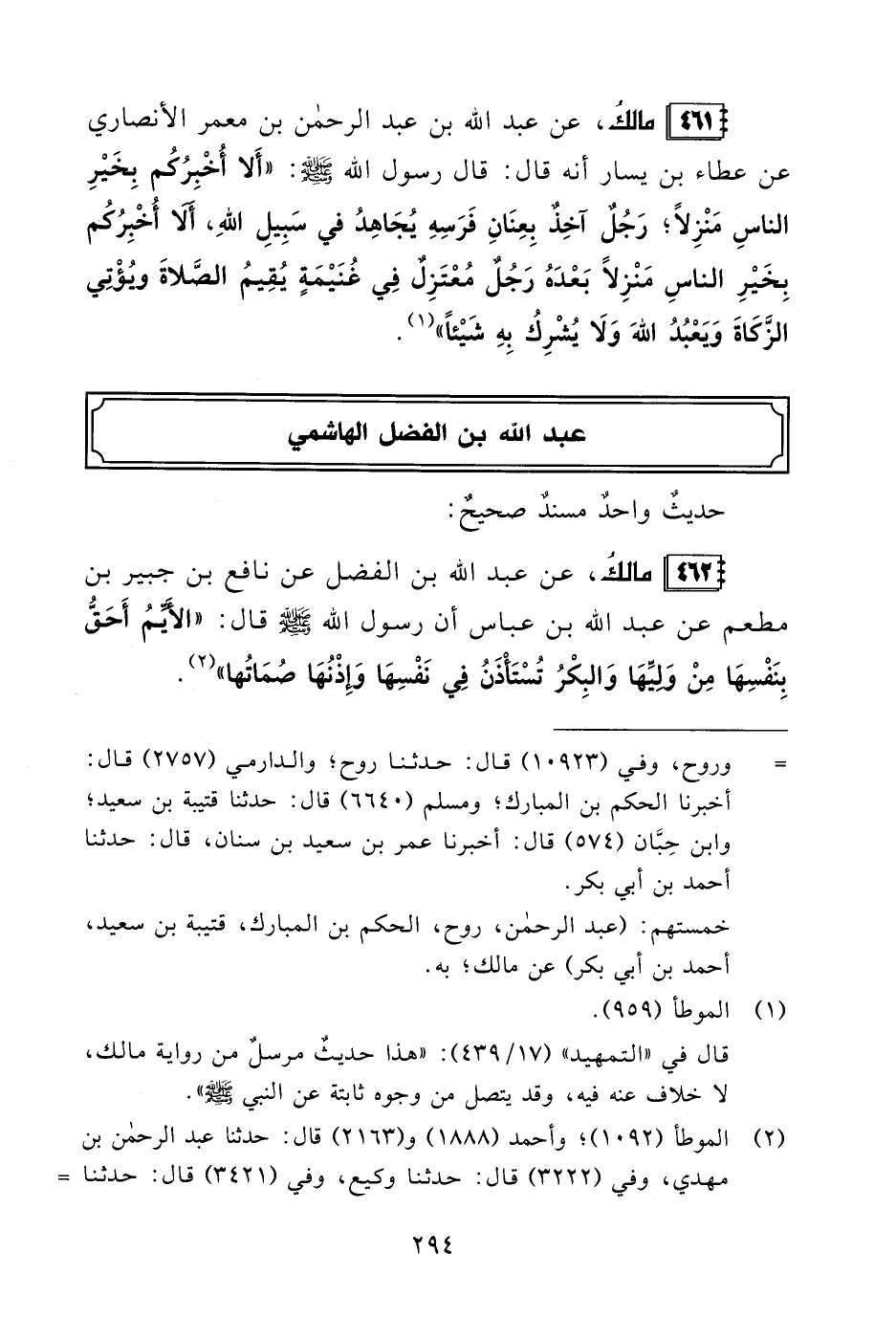 461 - مالكُ، عن عبد الله بن عبد الرحمن بن معمر الأنصاري عن عطاء بن يسار أنه قال: قال رسول الله - صلى الله عليه وسلم -: "أَلا أُخْبِرُكُم بِخَيْرِ الناسِ مَنْزِلًا، رَجُلٌ آخِذٌ بِعِنَانِ فَرَسِهِ يُجَاهِدُ في سَبِيلِ اللهِ، ألَا أُخْبِرُكم بِخَيْرِ الناسِ مَنْزِلًا بَعْدَهُ رَجُلٌ مُعْتَزِلٌ فِي غُنَيْمَةٍ يُقِيمُ الصَّلاةَ ويُؤْتِي الزَّكاةَ وَيَعْبُدُ اللهَ وَلَا يُشْرِكُ بِهِ شَيْئًا" (¬1).