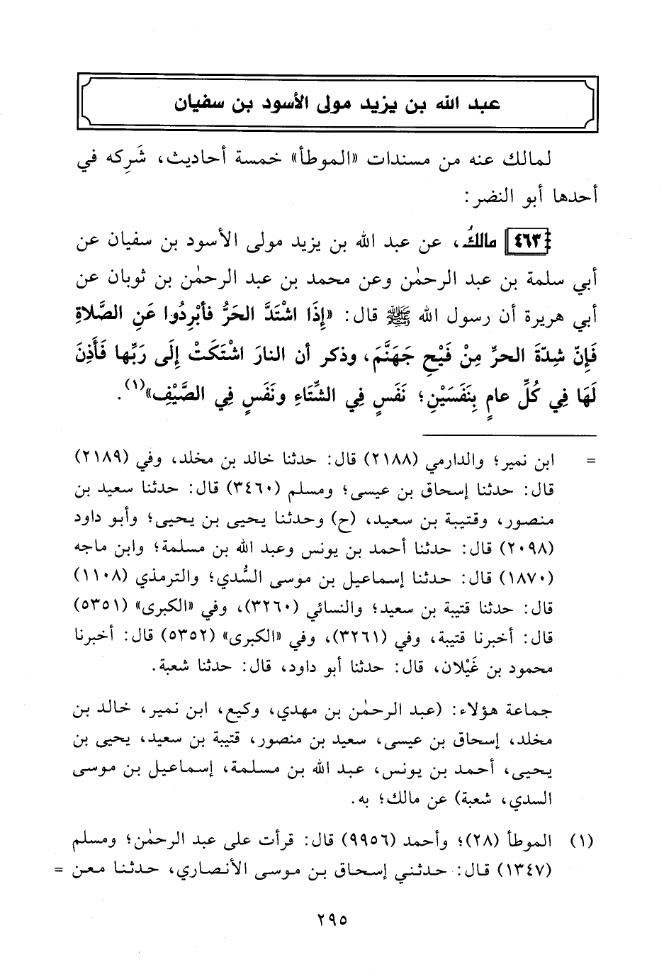 463 - مالكُ، عن عبد الله بن يزيد مولى الأسود بن سفيان عن أبي سلمة بن عبد الرحمن وعن محمد بن عبد الرحمن بن ثوبان عن أبي هريرة أن رسول الله - صلى الله عليه وسلم - قال: "إِذَا اشْتَدَّ الحَرُّ فأبْرِدُوا عَنِ الصَّلاةِ فَإِنّ شِدّةَ الحرِّ مِنْ فَيْحِ جَهَنَّمَ، وذكر أن النارَ اشْتَكَتْ إِلَى رَبِّها فَأَذِنَ لَهَا فِي كلِّ عامٍ بِنَفَسَيْنِ؛ نَفَسٍ فِي الشِّتَاءِ ونَفَسٍ فِي الصَّيْفِ" (¬1).