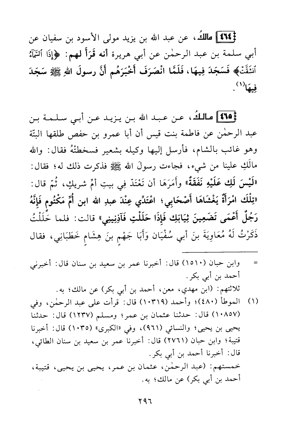 464 - مالكُ، عن عبد الله بن يزيد مولى الأسود بن سفيان عن أبي سلمة بن عبد الرحمن عن أبي هريرة أنه قَرَأَ لهم: {إِذَا السَّمَاءُ انْشَقَّتْ} فَسَجَدَ فِيهَا، فَلَمَّا انْصَرَفَ أَخْبَرَهُم أَنَّ رسولَ الله - صلى الله عليه وسلم - سَجَدَ فِيهَا (¬1).