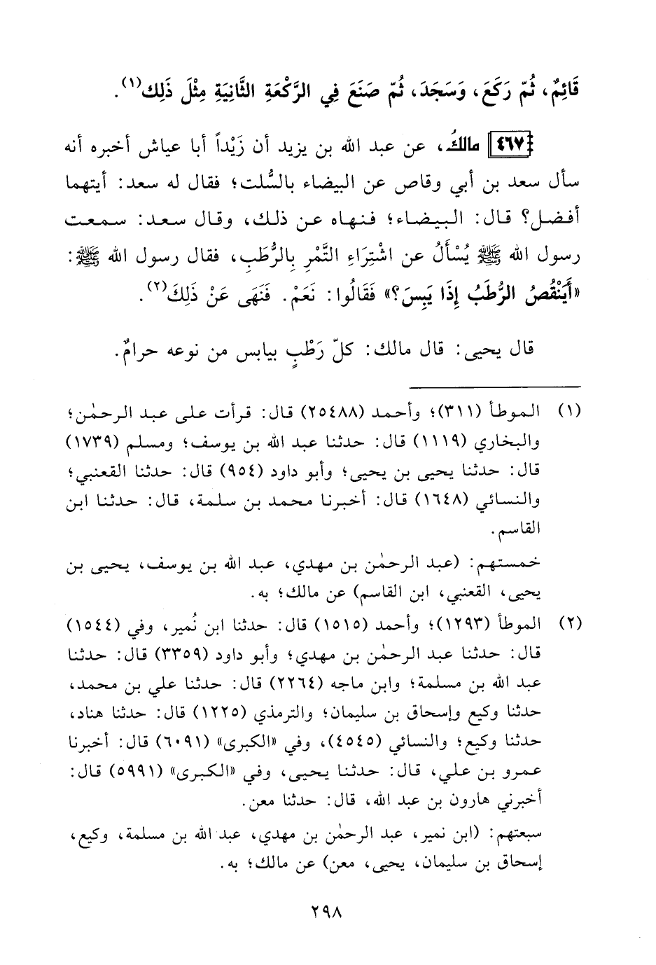 467 - مالكُ، عن عبد الله بن يزيد أن زَيْدًا أبا عياش أخبره أنه سأل سعد بن أبي وقاص عن البيضاء بالسُّلت؛ فقال له سعد: أيتهما أفضل؟ قال: البيضاء؛ فنهاه عن ذلك، وقال سعد: سمعت رسول الله - صلى الله عليه وسلم - يُسْأَلُ عن اشْتِرَاءِ التَّمْرِ بِالرُّطَبِ، فقال رسول الله - صلى الله عليه وسلم -: "أَيَنْقُصُ الرُّطَبُ إِذَا يَبِسَ؟ " فَقَالُوا: نَعَمْ. فَنَهَى عَنْ ذَلِكَ (¬2).