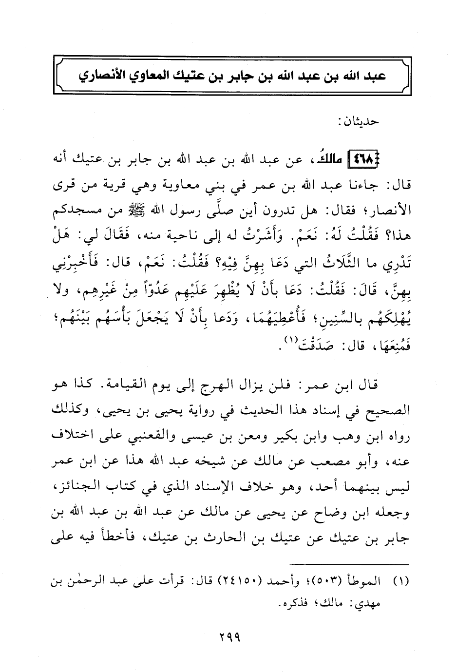 قال ابن عمر: فلن يزال الهرج إلى يوم القيامة. كذا هو الصحيح في إسناد هذا الحديث في رواية يحيى بن يحيى، وكذلك رواه ابن وهب وابن بكير ومعن بن عيسى والقعنبي على اختلاف عنه، وأبو مصعب عن مالك عن شيخه عبد الله هذا عن ابن عمر ليس بينهما أحد، وهو خلاف الإسناد الذي في كتاب الجنائز، وجعله ابن وضاح عن يحيى عن مالك عن عبد الله بن عبد الله بن جابر بن عتيك عن عتيك بن الحارث بن عتيك، فأخطأ فيه على