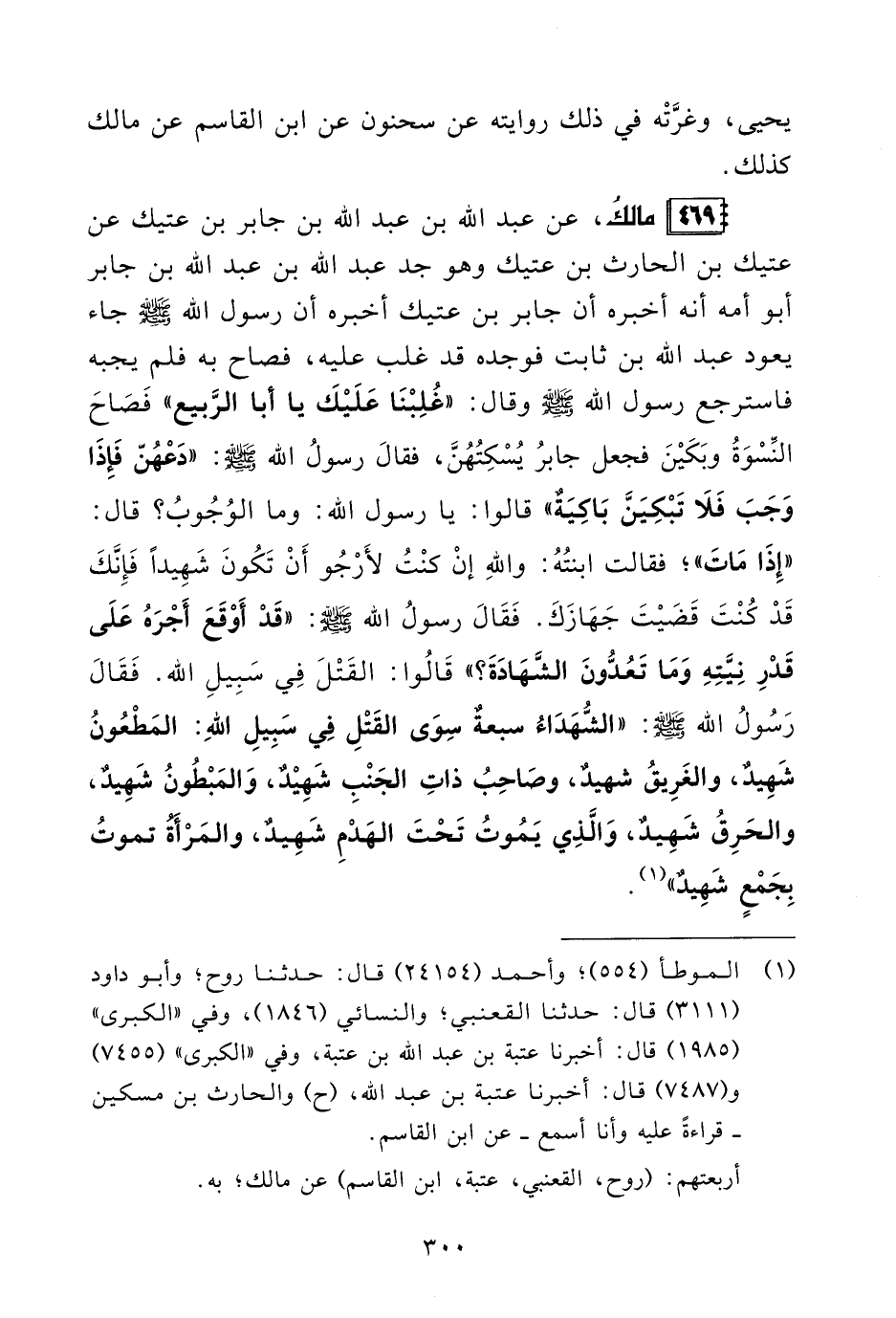 469 - مالكُ، عن عبد الله بن عبد الله بن جابر بن عتيك عن عتيك بن الحارث بن عتيك وهو جد عبد الله بن عبد الله بن جابر أبو أمه أنه أخبره أن جابر بن عتيك أخبره أن رسول الله - صلى الله عليه وسلم - جاء يعود عبد الله بن ثابت فوجده قد غلب عليه، فصاح به فلم يجبه فاسترجع رسول الله - صلى الله عليه وسلم - وقال: "غُلِبْنَا عَلَيْكَ يا أبا الرَّبيع" فَصَاحَ النِّسْوَةُ وبَكَيْنَ فجعل جابرُ يُسْكِتُهُنَّ، فقالَ رسولُ الله - صلى الله عليه وسلم -: "دَعْهُنّ فَإِذَا وَجَبَ فَلَا تَبْكِيَنَّ بَاكيَةٌ" قالوا: يا رسول الله: وما الوُجُوبُ؟ قال: "إِذَا مَاتَ"؛ فقالت ابنتُهُ: واللهِ إنْ كنْتُ لأَرْجُو أَنْ تَكُونَ شَهِيدًا فَإِنَّكَ قَدْ كُنْتَ قَضيْتَ جَهَازَكَ. فَقَالَ رسولُ الله - صلى الله عليه وسلم -: "قَدْ أَوْقَعَ أَجْرَهُ عَلَى قَدْرِ نِيَّتِهِ وَمَا تَعُدُّونَ الشَّهَادَةَ؟ " قَالُوا: القَتْلَ فِي سَبِيلِ الله. فَقَالَ رَسُولُ الله - صلى الله عليه وسلم -: "الشُّهَدَاءُ سبعةٌ سِوَى القَتْلِ فِي سَبِيلِ اللهِ: المَطْعُونُ شَهِيدٌ، والغَرِيقُ شهيدٌ، وصَاحِبُ ذاتِ الجَنْبِ شَهِيْدٌ، وَالمَبْطُونُ شَهِيدٌ، والحَرِقُ شَهِيدٌ، وَالَّذِي يَمُوتُ تَحْتَ الهَدْمِ شَهِيدٌ، والمَرْأةُ تموتُ بِجَمْعٍ شَهِيدٌ" (¬1).