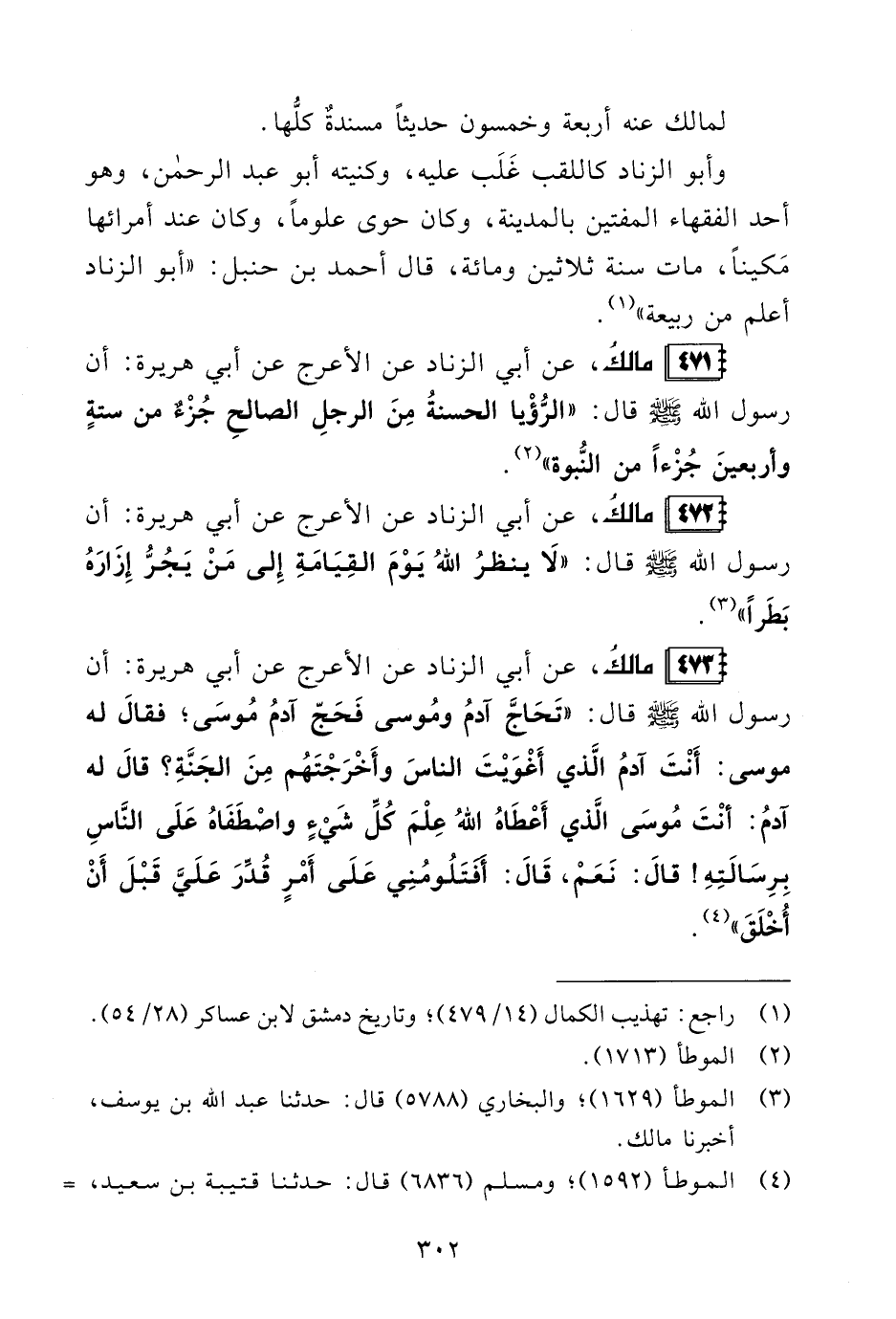 473 - مالكُ، عن أبي الزناد عن الأعرج عن أبي هريرة: أن رسول الله - صلى الله عليه وسلم - قال: "تَحَاجَّ آدمُ ومُوسى فَحَجّ آدمُ مُوسَى؛ فقالَ له موسى: أَنْتَ آدمُ الَّذي أَغْوَيْتَ الناسَ وأَخْرَجْتَهُم مِنَ الجَنَّةِ؟ قالَ له آدمُ: أنْتَ مُوسَى الَّذي أَعْطَاهُ اللهُ عِلْمَ كُلِّ شَيءٍ واصْطَفَاهُ عَلَى النَّاسِ بِرِسَالَتِهِ! قالَ: نَعَمْ، قَالَ: أَفَتَلُومُنِي عَلَى أَمْرٍ قُدِّرَ عَلَيَّ قَبْلَ أَنْ أُخْلَقَ" (¬4).