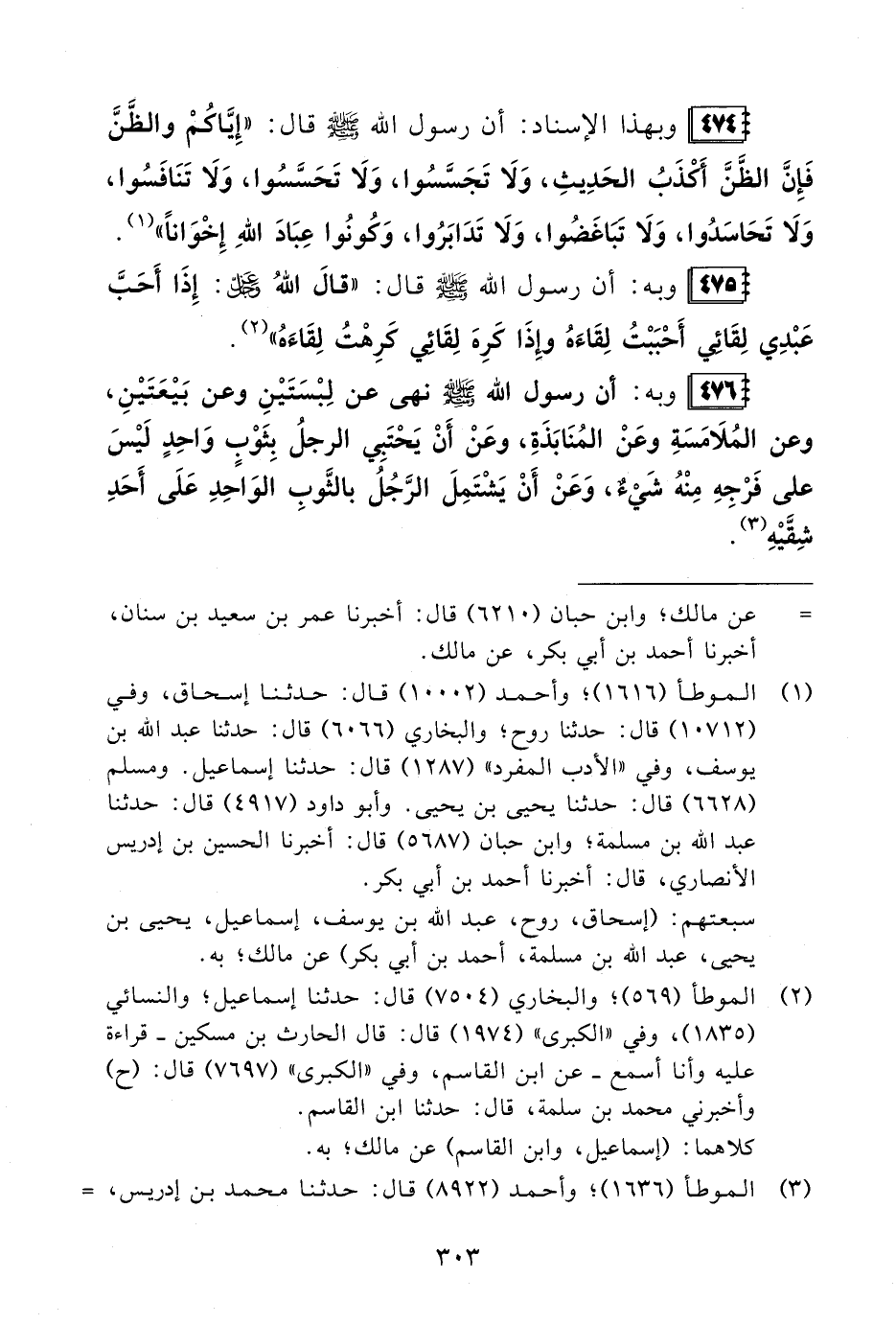 474 - وبهذا الإسناد: أن رسول الله - صلى الله عليه وسلم - قال: "إِيَّاكُمْ والظَّنَّ فَإِنَّ الظَّنَّ أَكْذَبُ الحَدِيثِ، وَلَا تَجَسَّسُوا، وَلَا تَحَسَّسُوا، وَلَا تَنَافَسُوا، وَلَا تَحَاسَدُوا، وَلَا تبَاغَضُوا، وَلَا تَدَابَرُوا، وَكُونُوا عِبَادَ اللهِ إِخْوَانًا" (¬1).