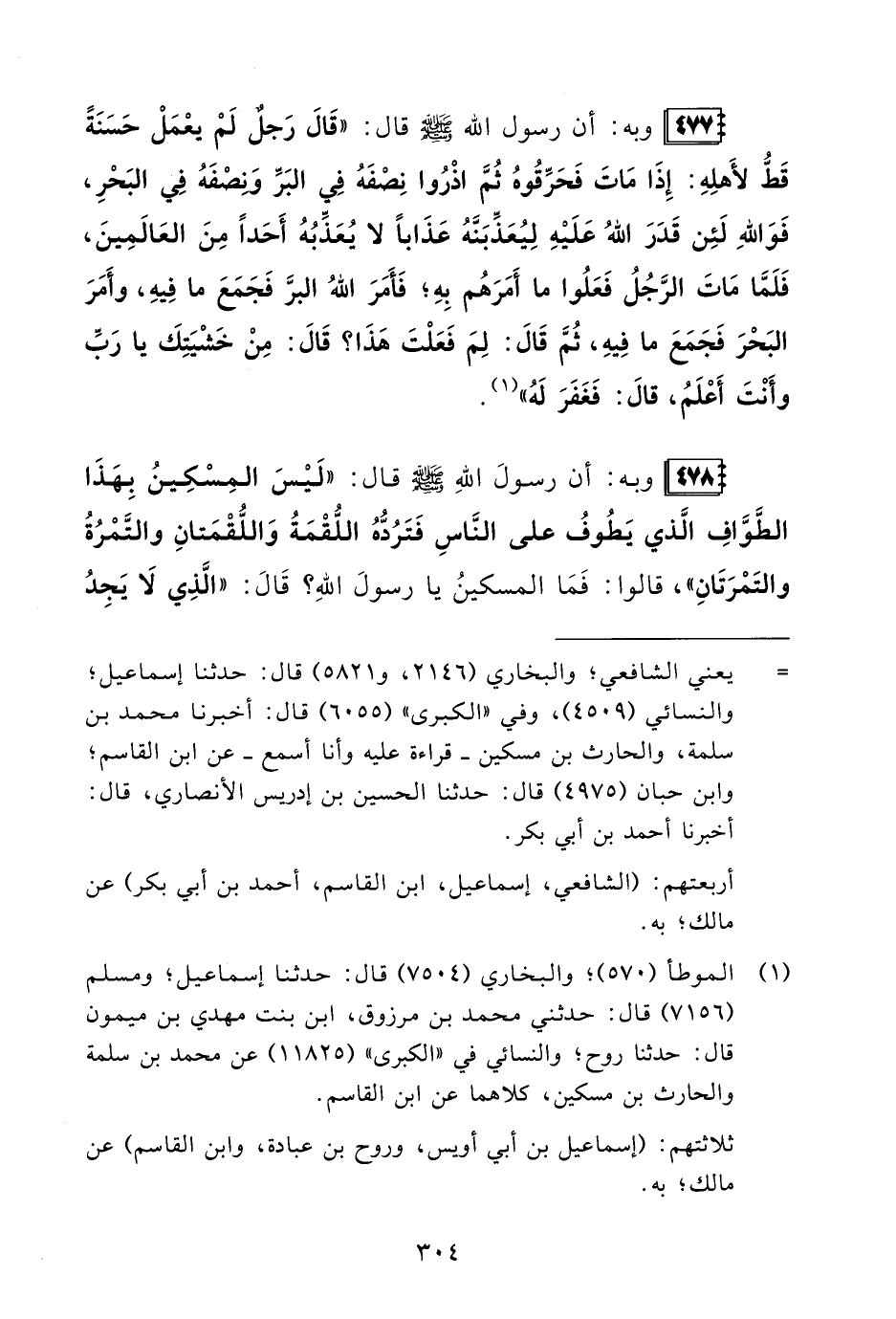 478 - وبه: أن رسولَ اللهِ - صلى الله عليه وسلم - قال: "لَيْسَ المِسْكِينُ بِهَذَا الطَّوَّافِ الَّذي يَطُوفُ على النَّاسِ فَتَرُدُّهُ اللُّقْمَةُ وَاللُّقْمَتانِ والتَّمْرُةُ والتَمْرَتَانِ"، قالوا: فَمَا المسكينُ يا رسولَ اللهِ؟ قَالَ: "الَّذِي لَا يَجِدُ