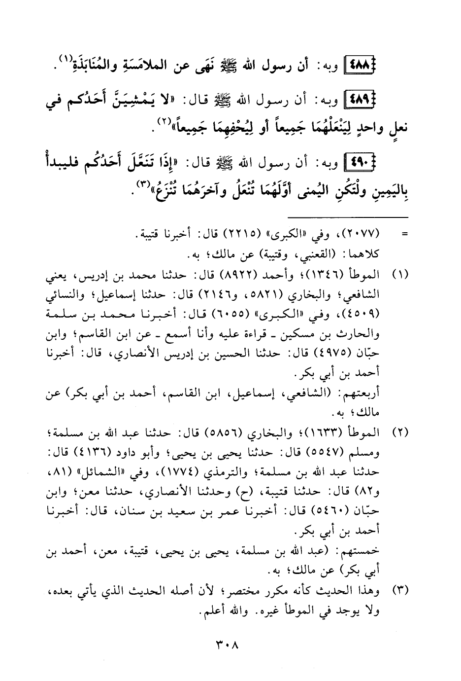 490 - وبه: أن رسول الله - صلى الله عليه وسلم - قال: "إِذَا تَنَعَّلَ أَحَدُكُم فليبدأْ بِاليَمِينِ ولْتَكُنِ اليُمنى أوَّلَهُمَا تُنْعَلُ وآخرَهُمَا تُنْزَعُ" (¬3).