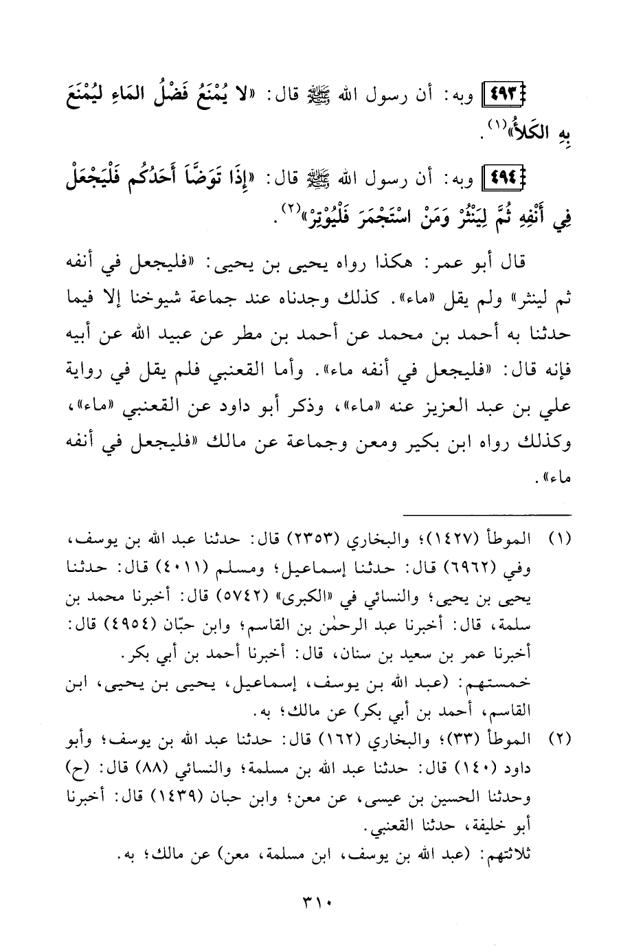 (¬2) الموطأ (33)؛ والبخاريُّ (162) قال: حدثنا عبد الله بن يوسف؛ وأبو داود (140) قال: حدثنا عبد الله بن مسلمة؛ والنسائيُّ (88) قال: (ح) وحدثنا الحسين بن عيسى، عن معن؛ وابن حبان (1439) قال: أخبرنا أبو خليفة، حدثنا القعنبي.