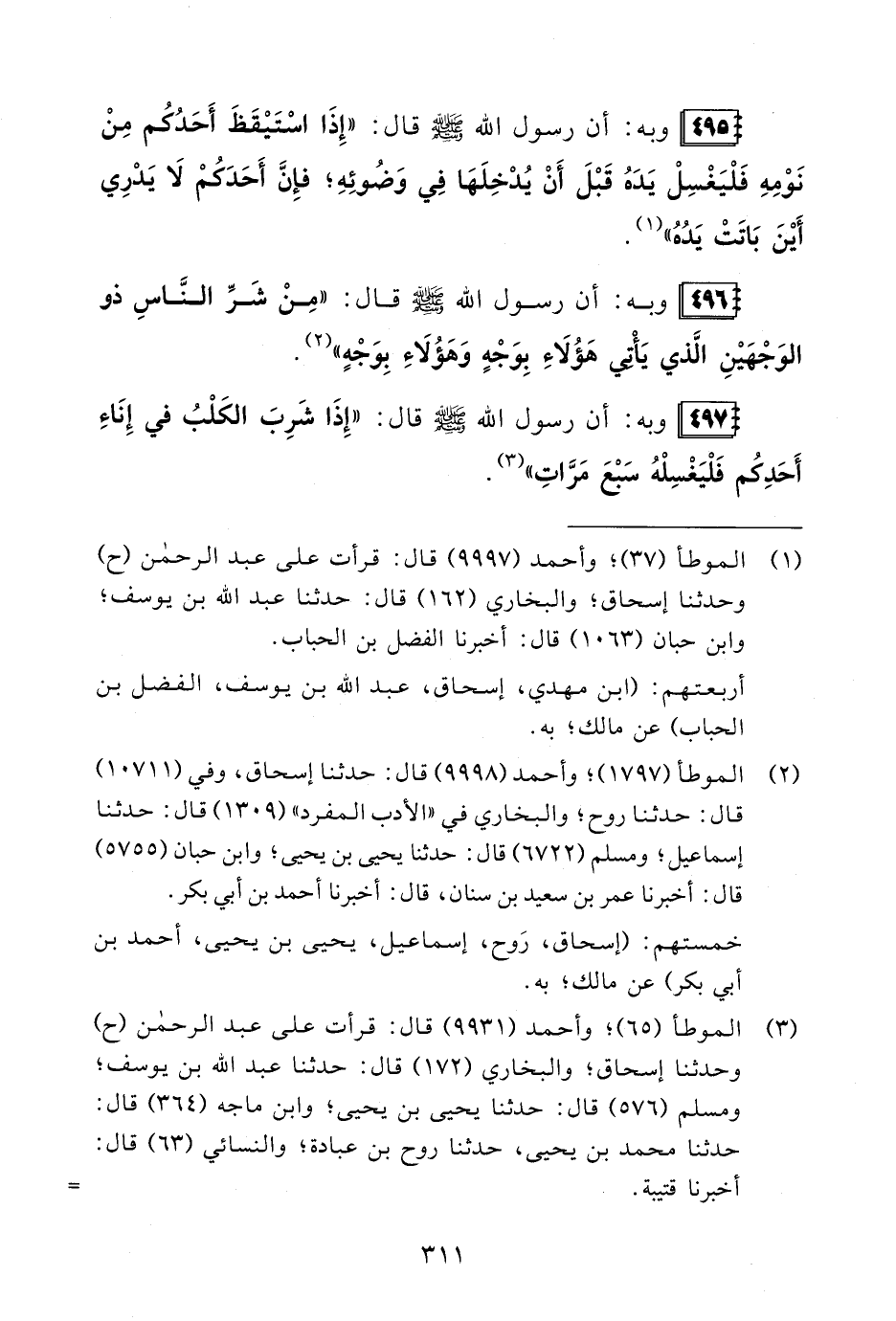 (¬3) الموطأ (65)؛ وأحمدُ (9931) قال: قرأت على عبد الرحمن (ح) وحدثنا إسحاق؛ والبخاريُّ (172) قال: حدثنا عبد الله بن يوسف؛ ومسلمٌ (576) قال: حدثنا يحيى بن يحيى، وابن ماجه (364) قال: حدثنا محمد بن يحيى، حدثنا روح بن عبادة؛ والنسائيُّ (63) قال: أخبرنا قتيبة. =