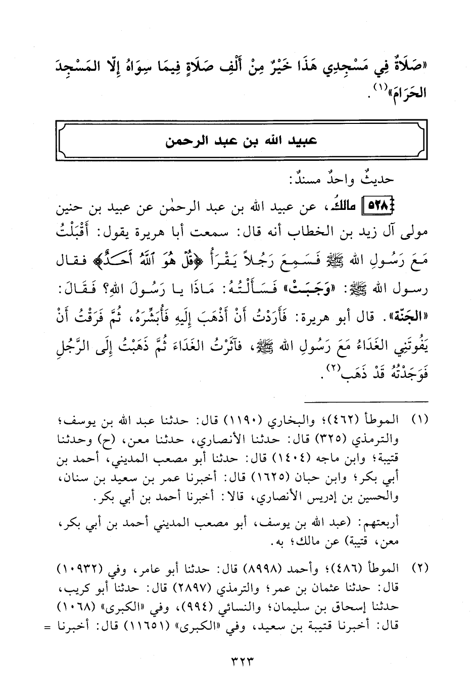 528 - مالكُ، عن عبيد الله بن عبد الرحمن عن عبيد بن حنين مولى آل زيد بن الخطاب أنه قال: سمعت أبا هريرة يقول: أَقْبَلْتُ مَعَ رَسُولِ الله - صلى الله عليه وسلم - فَسَمِعَ رَجُلًا يَقْرَأُ {قُلْ هُوَ اللَّهُ أَحَدٌ} فقال رسول الله - صلى الله عليه وسلم -: "وَجَبَتْ" فَسَأَلْتُهُ: مَاذَا يا رَسُولَ اللهِ؟ فَقَالَ: "الجَنّة". قال أبو هريرة: فَأَرَدْتُ أَنْ أَذْهَبَ إِلَيهِ فَأُبَشِّرَهُ، ثُمَّ فَرَقْتُ أَنْ يَفُوتَنِي الغَدَاءُ مَعَ رَسُولِ الله - صلى الله عليه وسلم -، فآثَرْتُ الغَدَاءَ ثُمَّ ذَهَبْتُ إِلَى الرَّجُلِ فَوَجَدْتُهُ قَدْ ذَهَب (¬2).