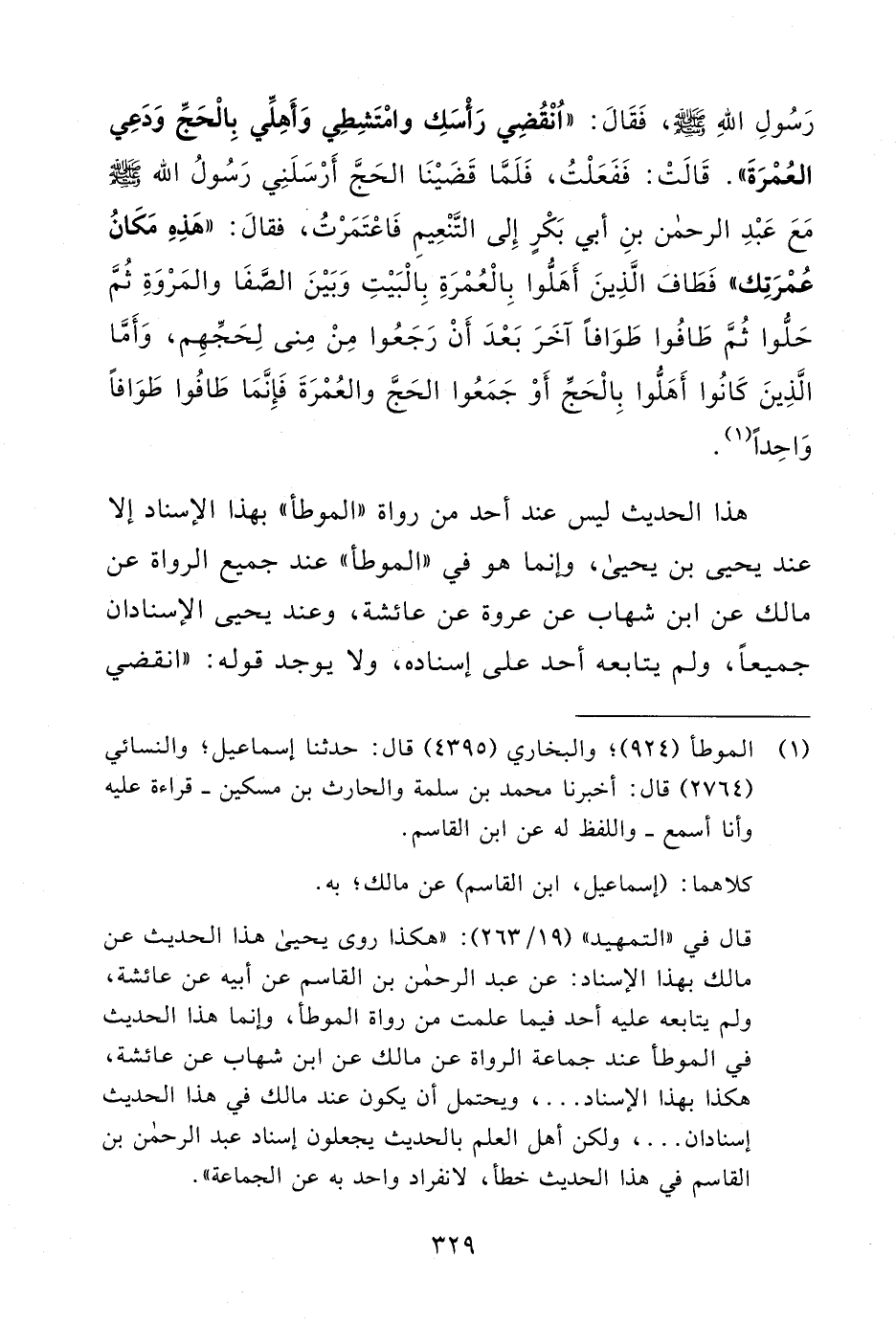 هذا الحديث ليس عند أحد من رواة "الموطأ" بهذا الإسناد إلا عند يحيى بن يحيى، وإنما هو في "الموطأ" عند جميع الرواة عن مالك عن ابن شهاب عن عروة عن عائشة، وعند يحيى الإسنادان جميعًا، ولم يتابعه أحد على إسناده، ولا يوجد قوله: "انقضي