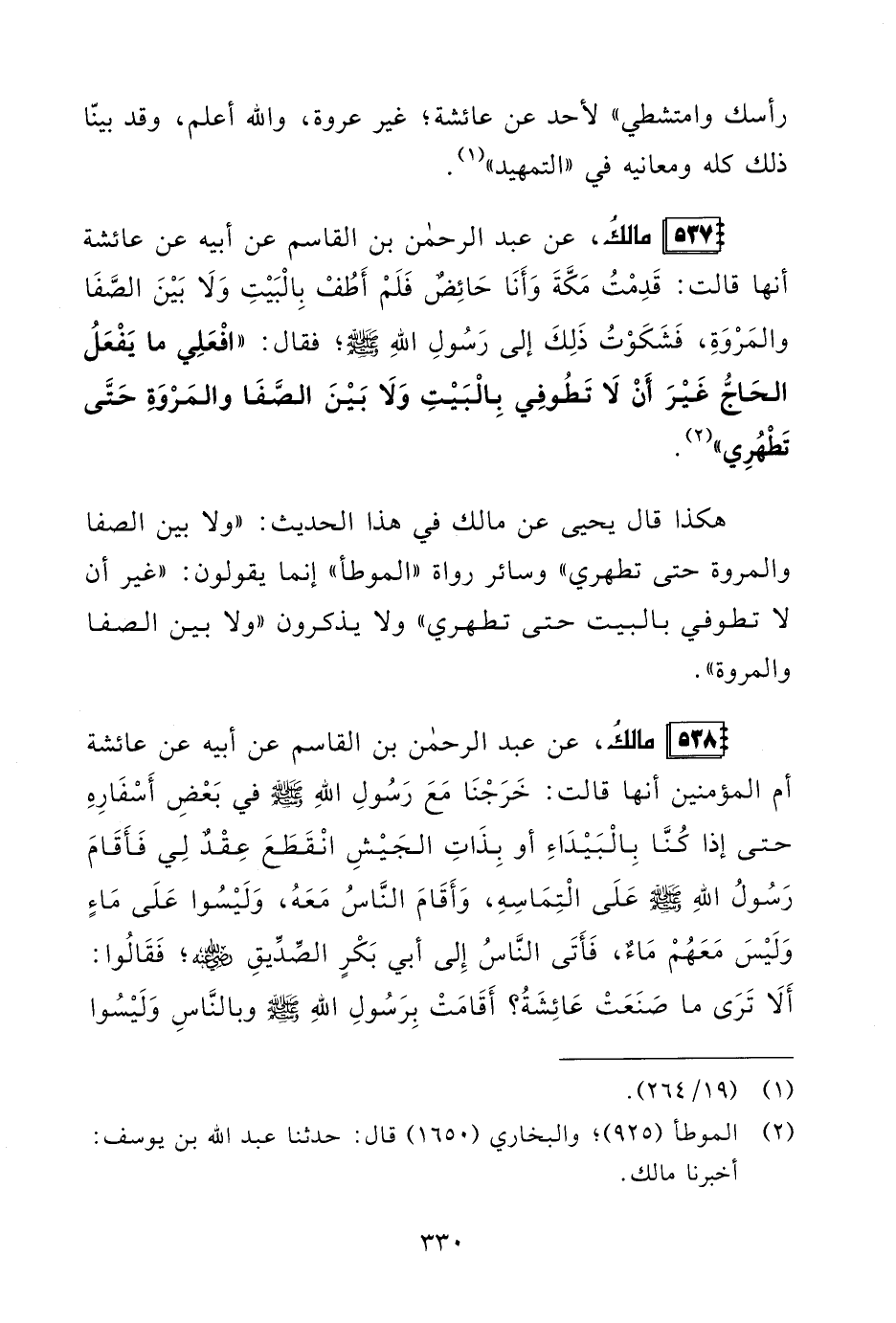 537 - مالكُ، عن عبد الرحمن بن القاسم عن أبيه عن عائشة أنها قالت: قَدِمْتُ مَكَّةَ وَأَنَا حَائِضٌ فَلَمْ أَطُفْ بِالْبَيْتِ وَلَا بَيْنَ الصَّفَا والمَرْوَةِ، فَشَكَوْتُ ذَلِكَ إلى رَسُولِ اللهِ - صلى الله عليه وسلم -؛ فقال: "افْعَلِي ما يَفْعَلُ الحَاجُّ غَيْرَ أَنْ لَا تَطُوفِي بِالْبَيْتِ وَلَا بَيْنَ الصَّفَا والمَرْوَةِ حَتَّى تَطْهُرِي" (¬2).