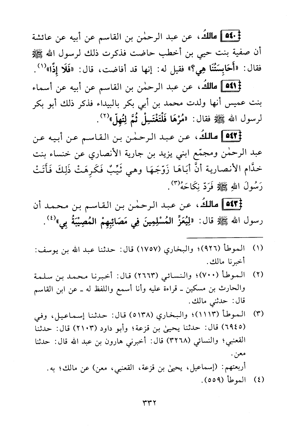 540 - مالكُ، عن عبد الرحمن بن القاسم عن أبيه عن عائشة أن صفية بنت حيي بن أخطب حاضت فذكرت ذلك لرسول الله - صلى الله عليه وسلم - فقال: "أَحَابِسَتُنَا هِي؟ " فقيل له: إنها قد أفاضت، قال: "فَلَا إِذًا" (¬1).