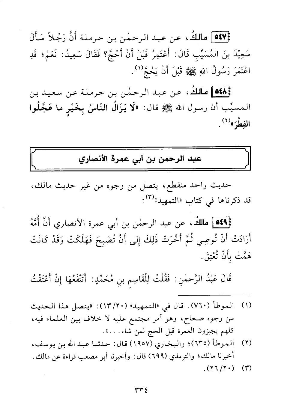 547 - مالكُ، عن عبد الرحمن بن حرملة أَنَّ رَجُلًا سَأَلَ سَعِيْدَ بنَ المُسَيِّبِ قَالَ: أَعْتَمِرُ قَبْلَ أَنْ أَحُجَّ؟ فَقَالَ سَعِيدُ: نَعَمْ؛ قَدِ اعْتَمَرَ رَسُولُ اللهِ - صلى الله عليه وسلم - قَبْلَ أَنْ يَحُجَّ (¬1).