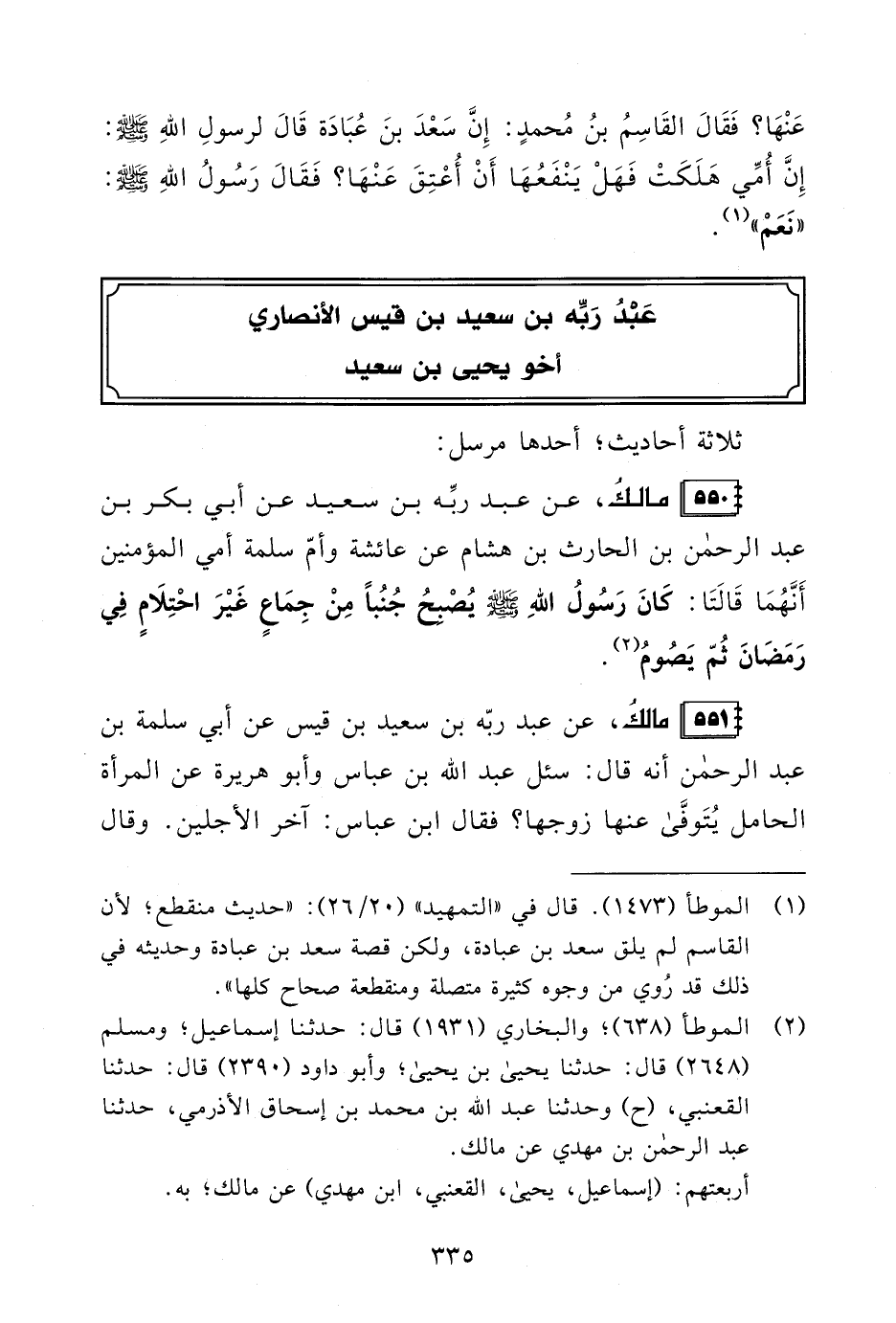 551 - مالكُ، عن عبد ربّه بن سعيد بن قيس عن أبي سلمة بن عبد الرحمن أنه قال: سئل عبد الله بن عباس وأبو هريرة عن المرأة الحامل يُتَوفَّى عنها زوجها؟ فقال ابن عباس: آخر الأجلين. وقال