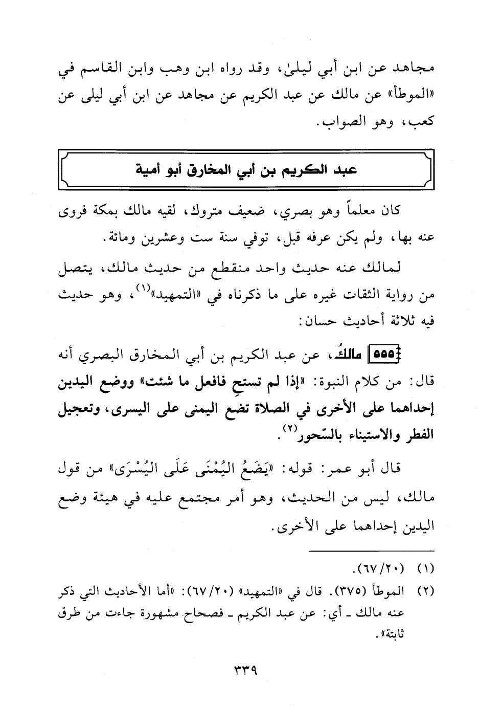 (¬2) الموطأ (375). قال في "التمهيد" (20/ 67): "أما الأحاديث التي ذكر عنه مالك -أي: عن عبد الكريم- فصحاح مشهورة جاءت من طرق ثابتة".