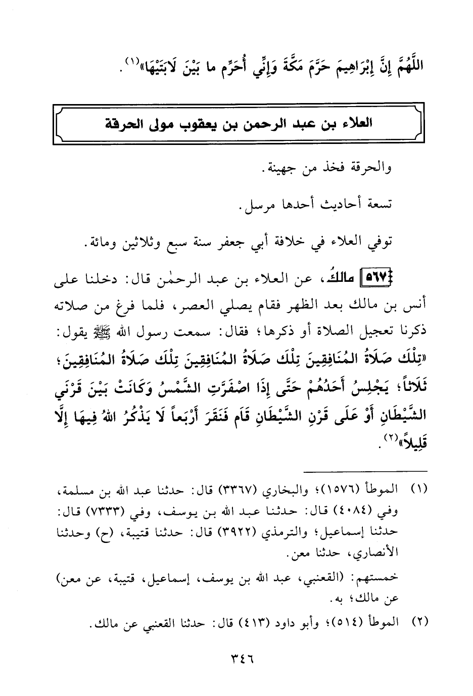 567 - مالكُ، عن العلاء بن عبد الرحمن قال: دخلنا على أنس بن مالك بعد الظهر فقام يصلي العصر، فلما فرغ من صلاته ذكرنا تعجيل الصلاة أو ذكرها؛ فقال: سمعت رسول الله - صلى الله عليه وسلم - يقول: "تِلْكَ صَلَاةُ المُنَافِقِينَ تِلْكَ صَلَاةُ المُنَافِقِينَ تِلْكَ صَلَاةُ المُنَافِقِينَ؛ ثَلَاثًا، يَجْلِسُ أَحَدُهُمْ حَتَّى إِذَا اصْفَرَّتِ الشَّمْسُ وَكَانَتْ بَيْنَ قَرْنَي الشَّيْطَانِ أَوْ عَلَى قَرْنِ الشَّيْطَانِ قَاَم فَنَقَرَ أَرْبَعًا لَا يَذْكُرُ اللهُ فِيهَا إِلَّا قَلِيلًا" (¬2).