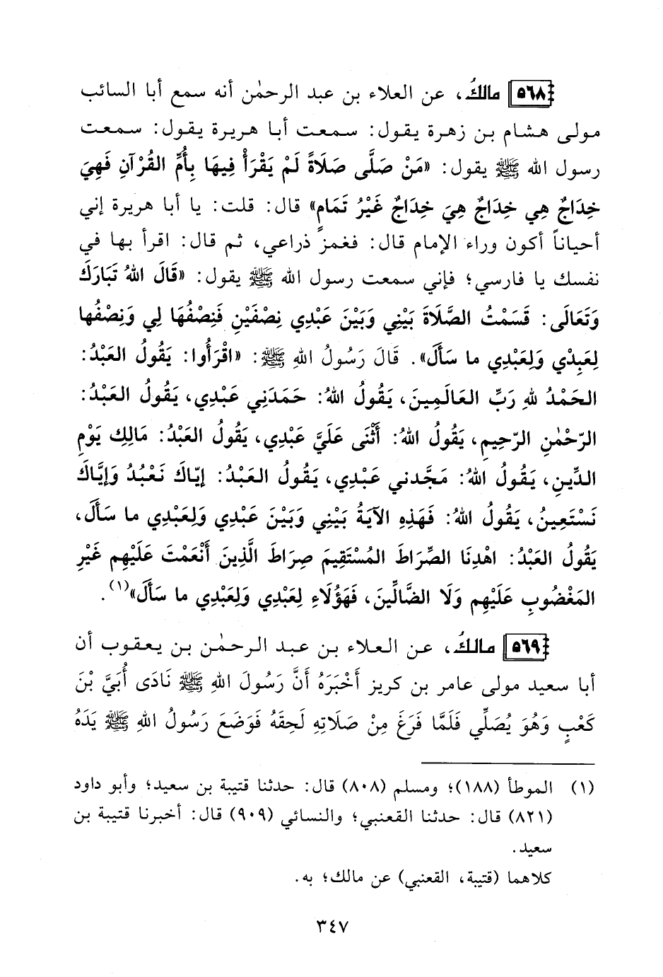 568 - مالكُ، عن العلاء بن عبد الرحمن أنه سمع أبا السائب مولى هشام بن زهرة يقول: سمعت أبا هريرة يقول: سمعت رسول الله - صلى الله عليه وسلم - يقول: "مَنْ صَلَّى صَلَاةً لَمْ يَقْرَأْ فِيهَا بِأُمِّ القُرْآنِ فَهِيَ خِدَاجٌ هِي خِدَاجٌ هِيَ خِدَاجٌ غَيْرُ تَمَامٍ" قال: قلت: يا أبا هريرة إني أحيانًا أكون وراء الإمام قال: فغمز ذراعي، ثم قال: اقرأ بها في نفسك يا فارسي؛ فإني سمعت رسول الله - صلى الله عليه وسلم - يقول: "قَالَ اللهُ تَبَارَكَ وَتَعَالَى: قَسَمْتُ الصَّلَاةَ بَيْنِي وَبَيْنَ عَبْدِي نِصْفَيْنِ فَنِصْفُهَا لِي وَنِصْفُها لِعَبِدْي وَلعَبْدِي ما سَأَل". قَالَ رَسُولُ اللهِ - صلى الله عليه وسلم -: "اقْرَأُوا: يَقُولُ العَبْدُ: الحَمْدُ للهِ رَبِّ العَالَمِينَ، يَقُولُ اللهُ: حَمَدَنِي عَبْدِي، يَقُولُ العَبْدُ: الرّحْمنِ الرّحِيمِ، يَقُولُ اللهُ: أثنَى عَلَيَّ عَبْدِي، يَقُولُ العَبْدُ: مَالِكِ يَوْمِ الدِّينِ، يَقُولُ اللهُ: مَجَّدني عَبْدِي، يَقُولُ العَبْدُ: إيّاكَ نَعْبُدُ وَإيَّاكَ نَسْتَعِينُ، يَقُولُ اللهُ: فَهَذِهِ الآيَةُ بَيْنِي وَبَيْنَ عَبْدِي وَلعَبْدِي ما سَأَل، يَقُولُ العَبْدُ: اهْدِنَا الصِّرَاطَ المُسْتَقِيمَ صِرَاطَ الَّذِينَ أَنْعَمْتَ عَلَيْهِم غَيْرِ المَغْضُوبِ عَلَيْهِم وَلَا الضَّالِّينَ، فَهَؤُلَاءِ لِعَبْدِي وَلعَبْدِي ما سَأَل" (¬1).