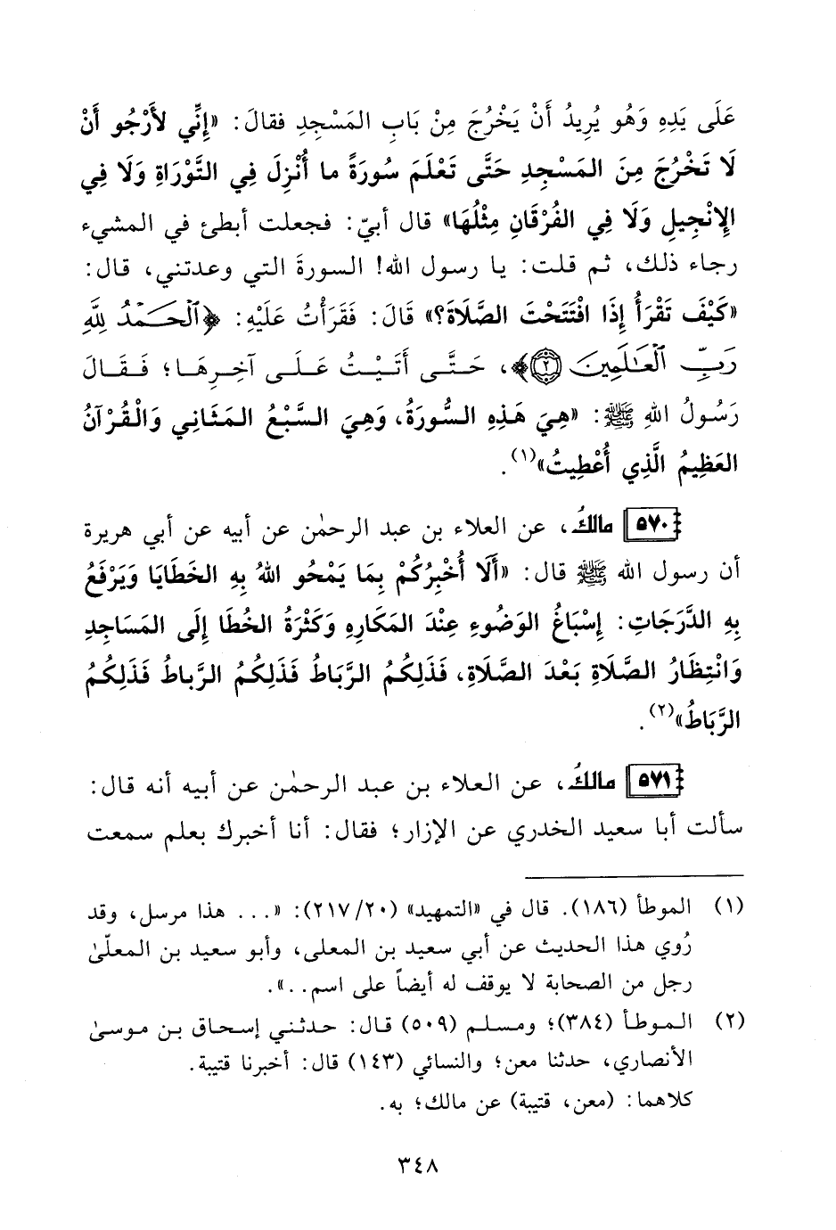 570 - مالكُ، عن العلاء بن عبد الرحمن عن أبيه عن أبي هريرة أن رسول الله - صلى الله عليه وسلم - قال: "ألا أُخْبِرُكُمْ بِمَا يَمْحُو اللهُ بِهِ الخَطَايَا وَيَرْفَعُ بِهِ الدَّرَجَاتِ: إِسْبَاغُ الوَضُوءِ عِنْدَ المَكَارِهِ وَكثْرَةُ الخُطَا إِلَى المَسَاجِدِ وَانْتِظَارُ الصَّلَاةِ بَعْدَ الصَّلَاةِ، فَذَلِكُمُ الرَّبَاطُ فَذَلِكُمُ الرَّباطُ فَذَلِكُمُ