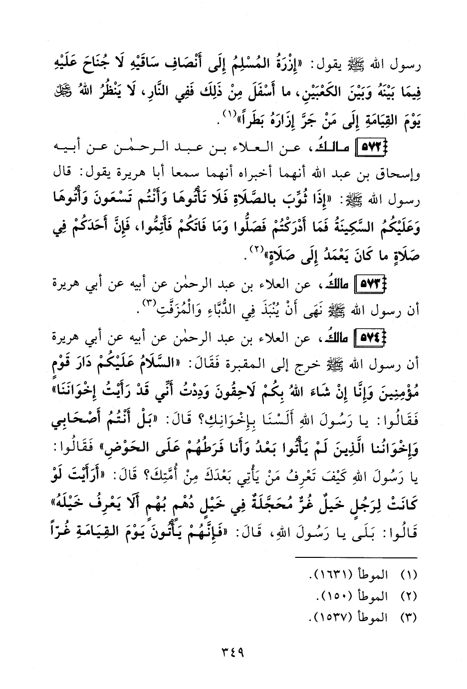 574 - مالكُ، عن العلاء بن عبد الرحمن عن أبيه عن أبي هريرة أن رسول الله - صلى الله عليه وسلم - خرج إلى المقبرة فَقَالَ: "السَّلَامُ عَلَيْكُمْ دَارَ قَوْمٍ مُؤْمِنِينَ وَإِنَّا إِنْ شَاءَ اللهُ بِكُمْ لَاحِقُونَ وَدِدْتُ أَنِّي قَدْ رَأَيْتُ إِخْوَانَنَا" فَقَالُوا: يا رَسُولَ اللهِ أَلَسْنَا بِإِخْوَانِكِ؟ قَالَ: "بَلْ أَنْتُمُ أَصْحَابِي وَإِخْوَانُنا الَّذِينَ لَمْ يَأْتُوا بَعْدُ وَأَنا فَرَطُهُمْ عَلَى الحَوْضِ" فَقَالُوا: يا رَسُولَ اللهِ كَيْفَ تَعْرِفُ مَنْ يَأْتِي بَعْدَكَ مِنْ أُمَّتِكَ؟ قَالَ: "أَرَأَيْتَ لَوْ كَانَتْ لِرَجُلٍ خَيلٌ غُرٌّ مُحَجَّلَةٌ فِي خَيْلٍ دُهْمِ بُهْمٍ ألا يَعْرِفُ خَيْلهُ" قَالُوا: بَلَى يا رَسُولَ اللهِ، قَالَ: "فَإِنَّهُمْ يَأْتُونَ يَوْمَ القِيَامَةِ غُرًّا