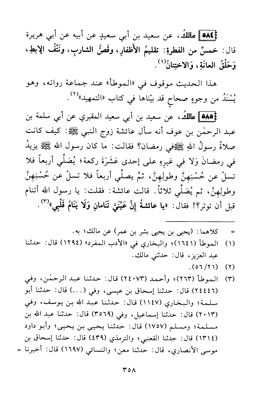 585 - مالكُ، عن سعيد بن أبي سعيد المقبري عن أبي سلمة بن عبد الرحمن بن عوف أنه سأل عائشة زوج النبي - صلى الله عليه وسلم -: كيف كانت صلاةُ رسولُ اللهِ - صلى الله عليه وسلم - في رمضان؟ فقالت: ما كان رسول الله - صلى الله عليه وسلم - يزيدُ في رمضانَ وَلا في غيرِهِ على إحدى عَشَرَةَ ركعة؛ يُصَلِّي أربعًا فلا تسلْ عن حُسْنِهِنَّ وطولِهِنَّ، ثمَّ يصلِّي أربعًا فلا تسلْ عن حُسْنِهِنَّ وطولِهِنَّ، ثم يُصلِّي ثلاثًا. قالت عائشة: فقلت: يا رسول الله أتنام قبل أن توتر؟ ! فقال: "يا عائشةُ إِنَّ عَيْنَيَّ تَنَامانِ وَلَا يَنَامُ قَلْبِي" (¬3).