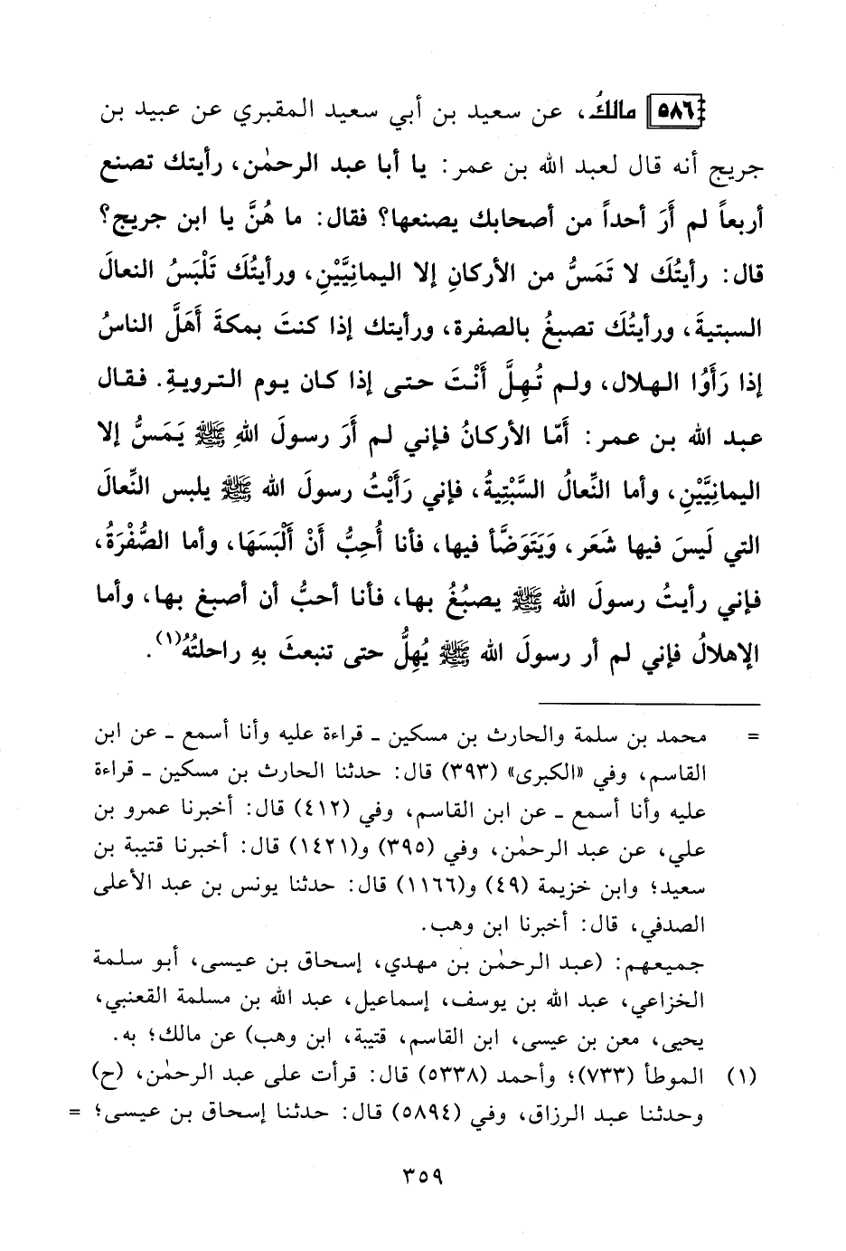 586 - مالكُ، عن سعيد بن أبي سعيد المقبري عن عبيد بن جريج أنه قال لعبد الله بن عمر: يا أبا عبد الرحمن، رأيتك تصنع أربعًا لم أَرَ أحدًا من أصحابك يصنعها؟ فقال: ما هُنَّ يا ابن جريج؟ قال: رأيتُكَ لا تَمَسُّ من الأركانِ إلا اليمانِيَّيْنِ، ورأيتُكَ تَلْبَسُ النعالَ السبتيةَ، ورأيتُكَ تصبغُ بالصفرة، ورأيتك إذا كنتَ بمكةَ أَهَلَّ الناسُ إذا رَأَوُا الهلال، ولم تُهِلِّ أَنْتَ حتى إذا كان يوم الترويةِ. فقال عبد الله بن عمر: أَمّا الأركانُ فإني لم أَرَ رسولَ الله - صلى الله عليه وسلم - يَمَسُّ إلا اليمانِيَّيْنِ، وأما النِّعالُ السَّبْتِيةُ، فإني رَأَيْتُ رسولَ الله - صلى الله عليه وسلم - يلبس النِّعالَ التي لَيسَ فيها شَعَر، وَيَتَوَضَّأ فيها، فأنا أُحِبُّ أَنْ ألبَسَهَا، وأما الصُّفْرَةُ، فإني رأيتُ رسولَ الله - صلى الله عليه وسلم - يصبُغُ بها، فأنا أحبُّ أن أصبغ بها، وأما الإهلالُ فإني لم أر رسولَ الله - صلى الله عليه وسلم - يُهِلُّ حتى تنبعثَ بهِ راحلتُهُ (¬1).