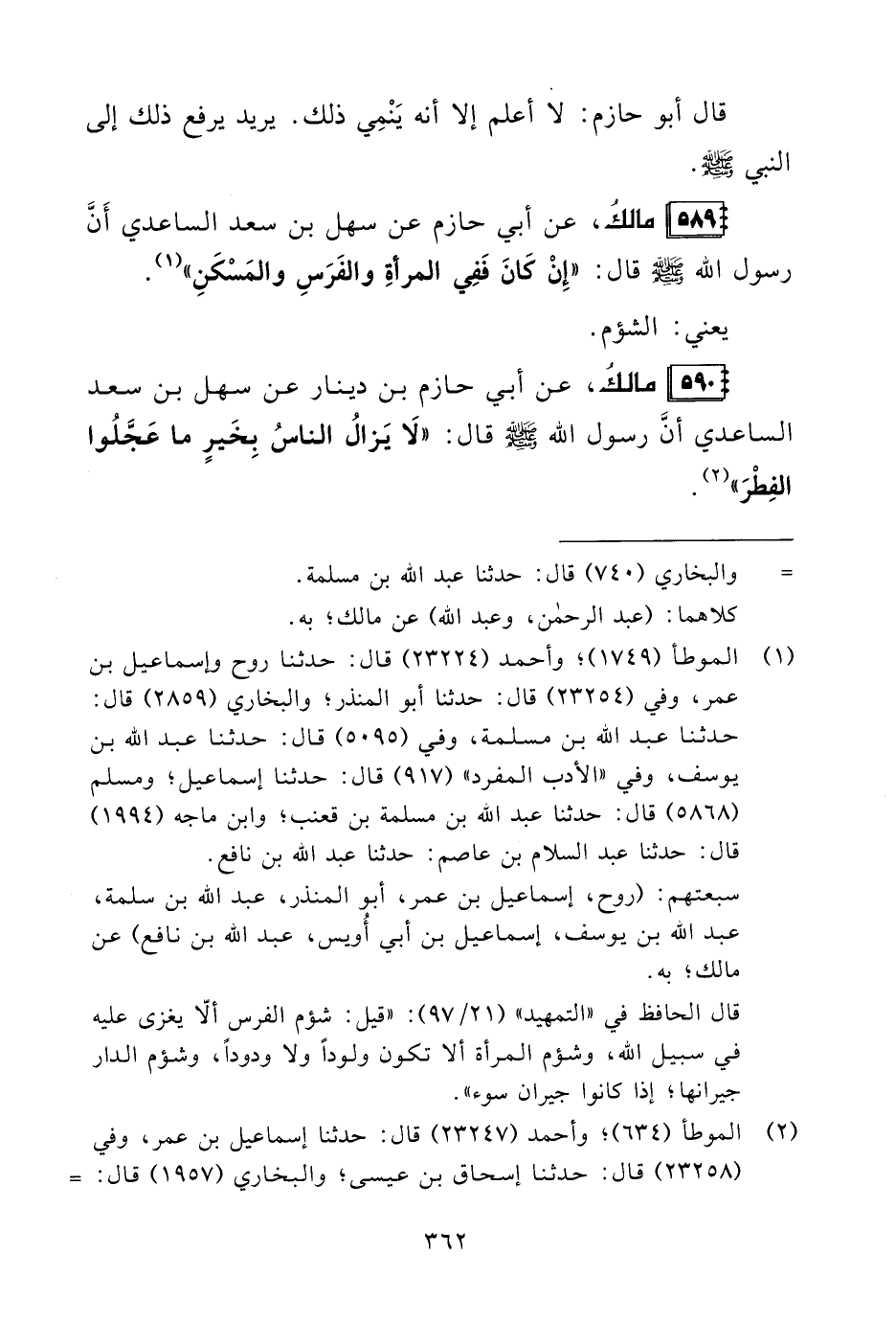 589 - مالكُ، عن أبي حازم عن سهل بن سعد الساعدي أَنَّ رسول الله - صلى الله عليه وسلم - قال: "إِنْ كَانَ فَفِي المرأةِ والفَرَسِ والمَسْكَنِ" (¬1).