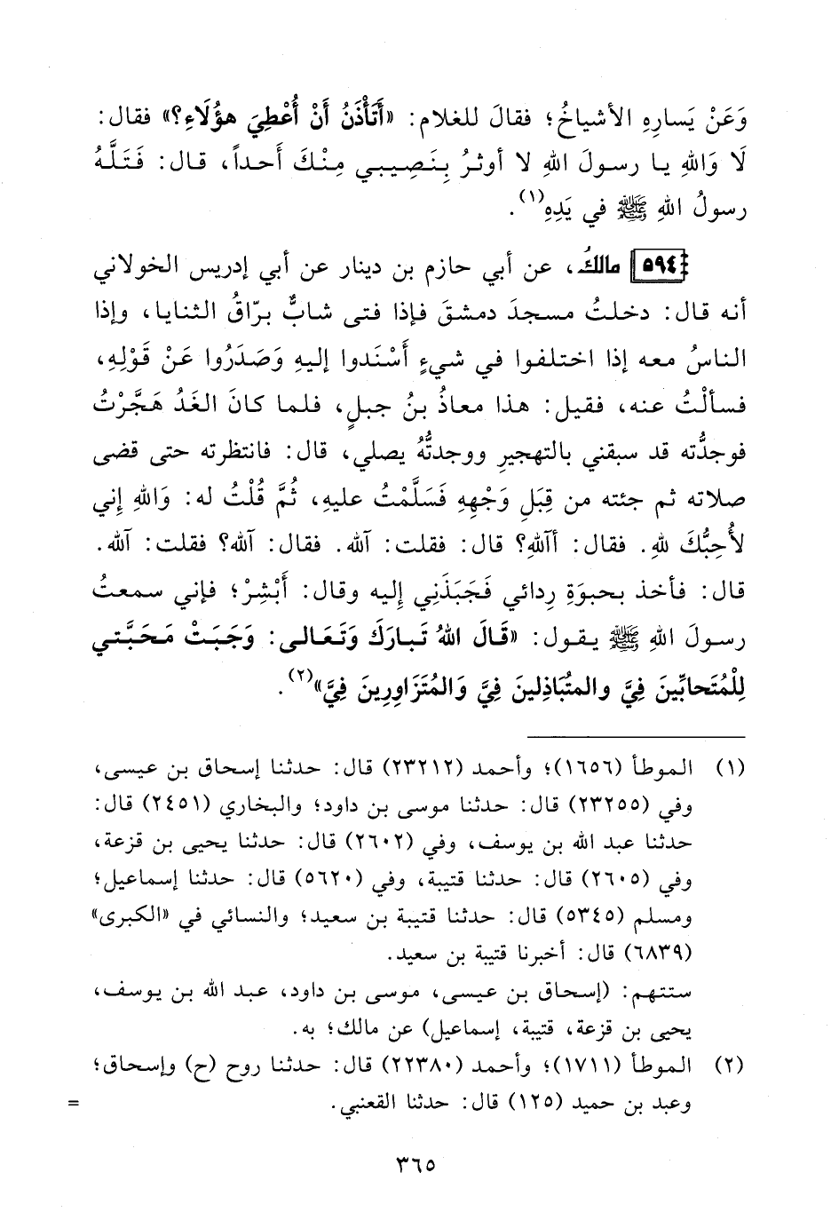 594 - مالكُ، عن أبي حازم بن دينار عن أبي إدريس الخولاني أنه قال: دخلتُ مسجدَ دمشقَ فإذا فتى شابٌّ برّاقُ الثنايا، وإذا الناسُ معه إذا اختلفوا في شيءٍ أَسْنَدوا إليهِ وَصَدَرُوا عَنْ قَوْلِهِ، فسألْتُ عنه، فقيل: هذا معاذُ بنُ جبلٍ، فلما كانَ الغَدُ هَجَّرْتُ فوجدُّته قد سبقني بالتهجيرِ ووجدتُّهُ يصلي، قال: فانتظرته حتى قضى صلاته ثم جئته من قِبَلِ وَجْهِهِ فَسَلَّمْتُ عليهِ، ثُمَّ قُلْتُ له: وَاللهِ إِني لأُحِبُّكَ للهِ. فقال: أآللهِ؟ قال: فقلت: آلله. فقال: آلله؟ فقلت: آلله. قال: فأخذ بحبوَةِ رِدائي فَجَبَذَنِي إِليه وقال: أَبْشِرْ، فإني سمعتُ رسولَ الله - صلى الله عليه وسلم - يقول: "قَالَ اللهُ تَبارَكَ وَتَعَالى: وَجَبَتْ مَحَبَّتي لِلْمُتَحابِّينَ فِيَّ والمتُبَاذِلينَ فِيَّ وَالمُتَزَاوِرِينَ فِيَّ" (¬2).