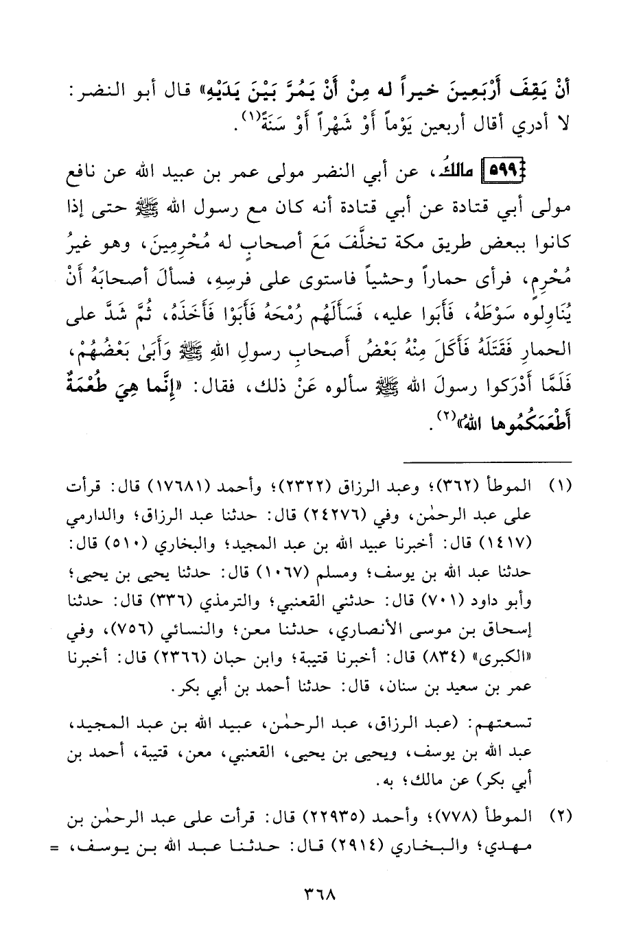 599 - مالكُ، عن أبي النضر مولى عمر بن عبيد الله عن نافع مولى أبي قتادة عن أبي قتادة أنه كان مع رسول الله - صلى الله عليه وسلم - حتى إذا كانوا ببعض طريق مكة تخلَّفَ مَعَ أصحابٍ له مُحْرِمِينَ، وهو غيرُ مُحْرِمٍ، فرأى حمارًا وحشيًا فاستوى على فرسِهِ، فسألَ أصحابَهُ أَنْ يُنَاوِلوه سَوْطَهُ، فَأَبَوا عليه، فَسَأَلَهُم رُمْحَهُ فَأَبَوْا فَأَخَذَهُ، ثُمَّ شَدَّ على الحمارِ فَقَتَلَهُ فَأَكَلَ مِنْهُ بَعْضُ أَصحابِ رسولِ اللهِ - صلى الله عليه وسلم - وَأَبَى بَعْضُهُمْ، فَلَمَّا أَدْرَكوا رسولَ الله - صلى الله عليه وسلم - سألوه عَنْ ذلك، فقال: "إِنَّما هِيَ طُعْمَةٌ أَطْعَمَكُمُوها الله" (¬2).